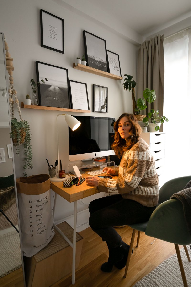 Bei der Wahl meines Arbeitsplatzes im Homeoffice habe ich mich für mein Schlafzimmer entschieden, da ich dort den Zugang zu meinem Balkon habe. Ich liebe es, mit natürlichem Licht zu arbeiten und schaue dabei gerne aus dem bodentiefen Fenster.