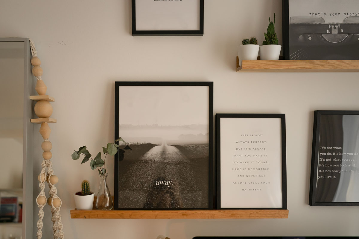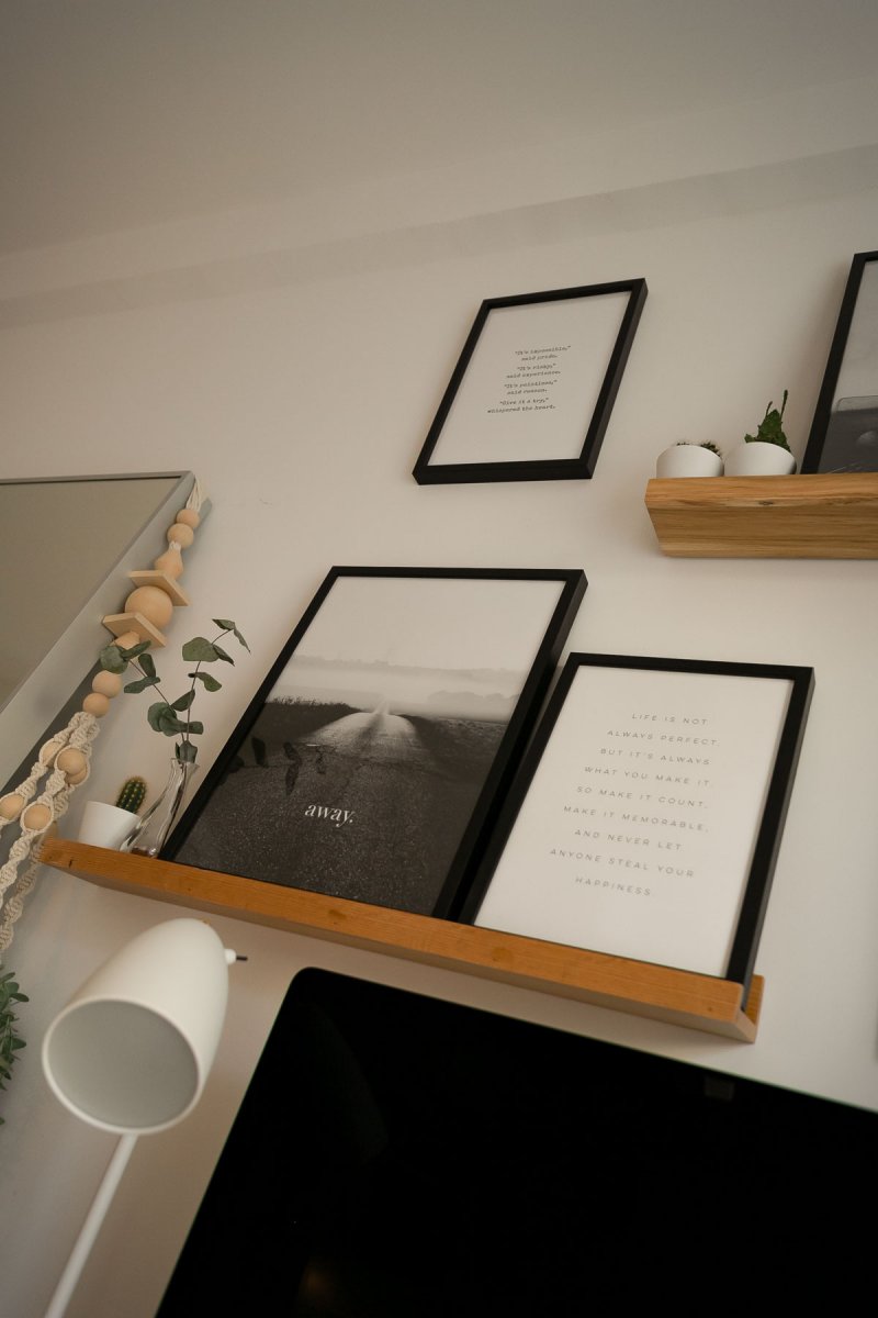 Bilder sind für mich eine der Dekoelemente auf die ich nicht verzichten kann. In meinem Schlafzimmer setze ich sie gezielt dazu ein, um den Arbeitsbereich vom Schlafbereich abzugrenzen. Ich habe mich für kreative Fotos und Sprüche entschieden, die mir Power für den Tag geben und mich inspirieren. Um den Holzkontrast auch an die Wand zu bringen, habe ich mich für eine Bilderleiste aus Eiche entschieden.