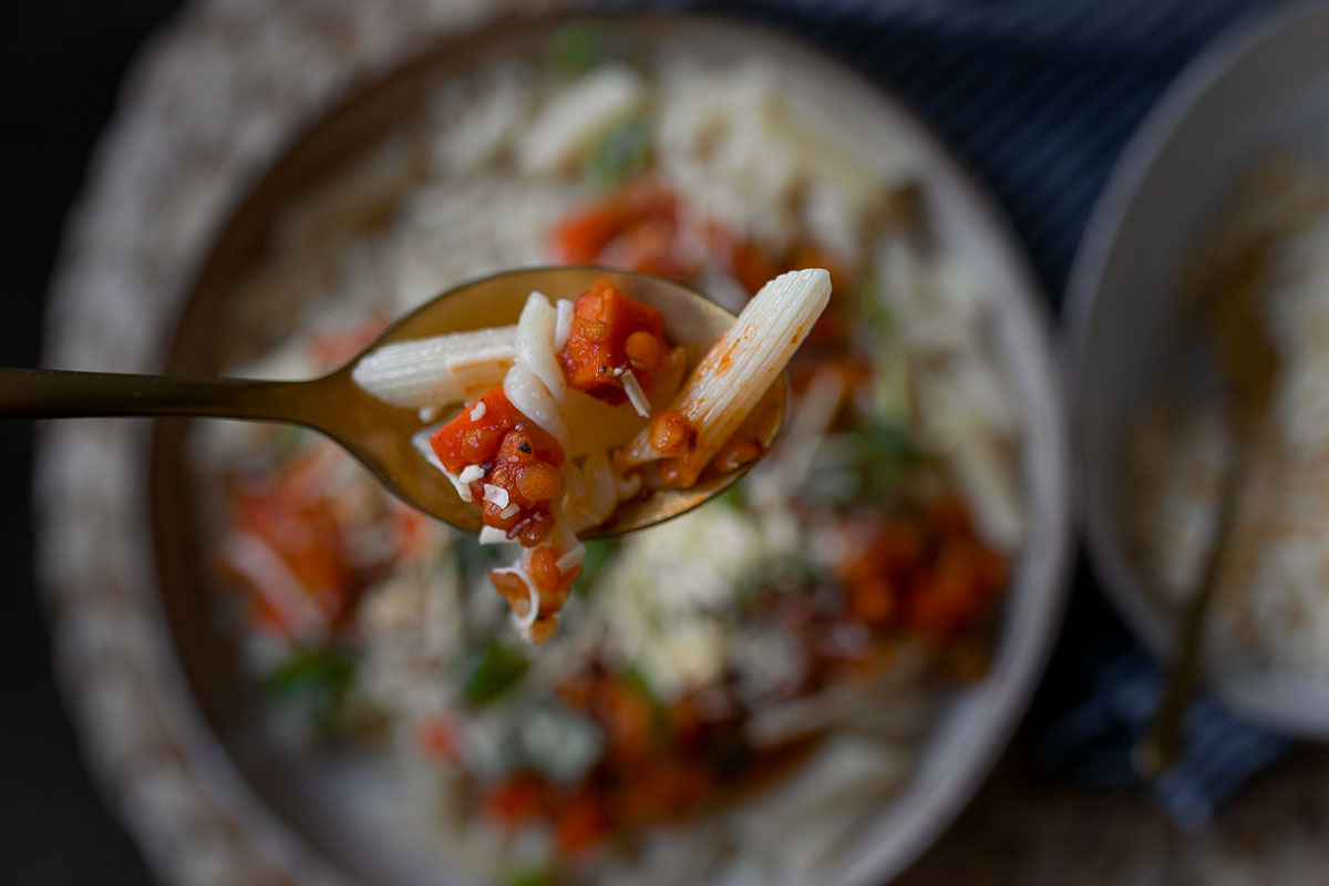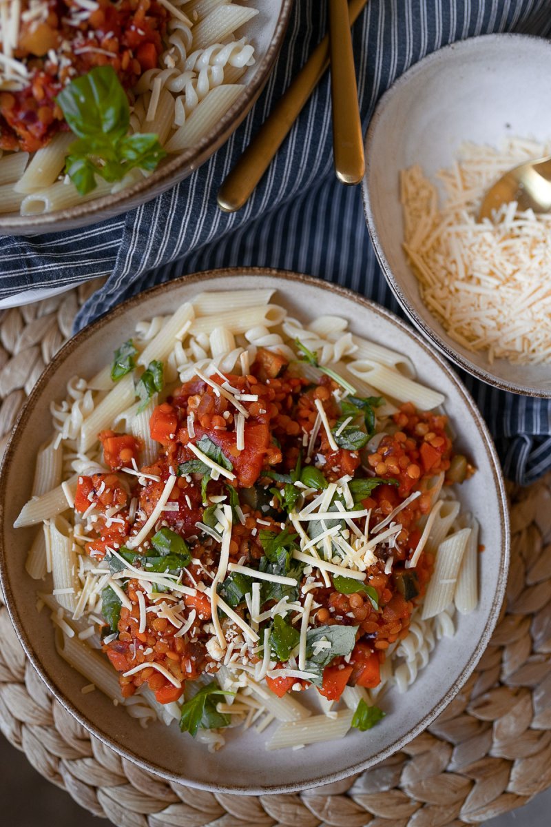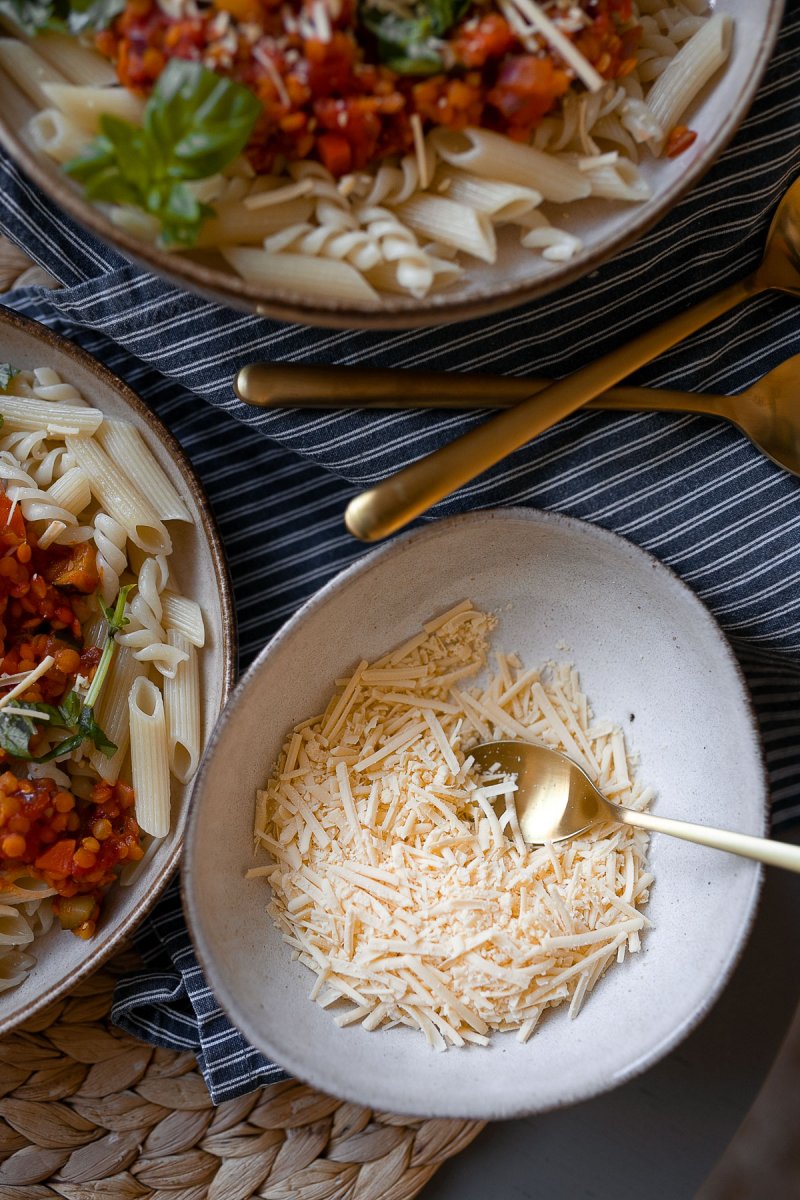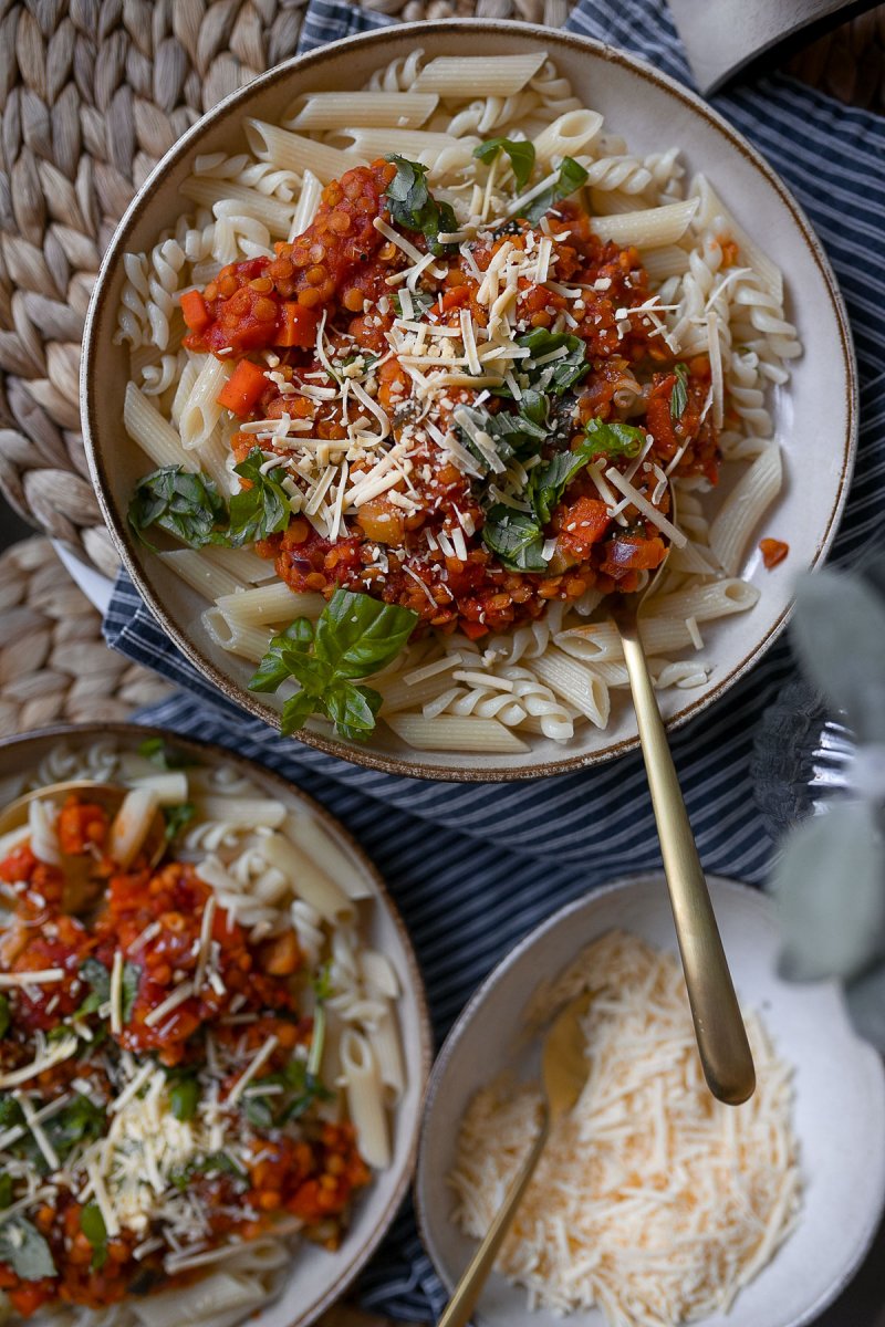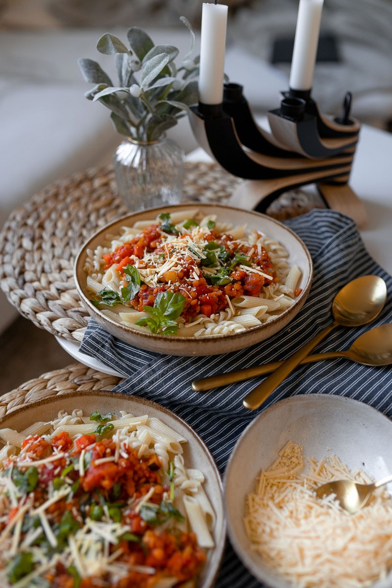 Vor allen in der kühleren Jahreszeit mag ich die Pasta-Variante mit roten Linsen so gerne. Es hat für mich schon Tradition, ein leckeres Pasta-Gericht zu kochen und diese bei Kerzenschein und einem guten Film zu genießen.