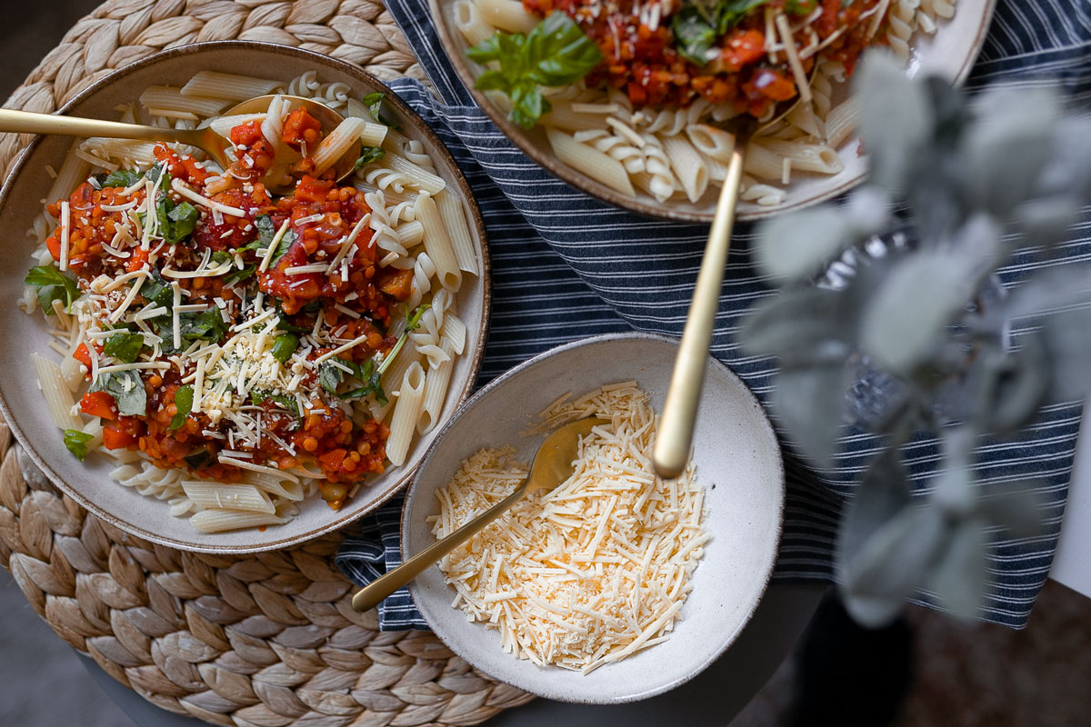- Bolognese mit veganen Reibekäse oder Parmesan und frischem Basilikum servieren.