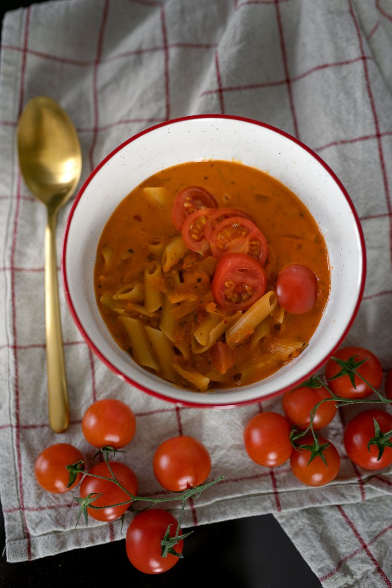 Doch seien wir mal realistisch, gerade jetzt bleibt unter der Woche nicht die Zeit, sich umfangreiche 3 Gänge-Menüs zu kreieren. Oftmals muss es einfach schnell gehen. Ich habe dennoch den Anspruch, das schnell gehen, auch gesund sein beinhaltet. Genau deshalb teile ich heute eine leckere Tomatensuppe mit euch, die sich fast wie in Zauberhand auch in eine leckere Pasta verwandeln kann. Wie das geht? Das verrate ich euch jetzt hier auf dem Foodblog mit meiner veganen Tomatensuppe mit Dinkelnudeln.