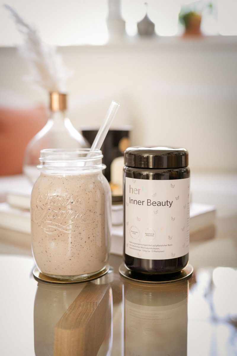 Um die Darmflora zu unterstützen und sich aufzubauen, wenn sie aus dem Gleichgewicht geraten ist, kann ich euch Inner Beauty nur ans Herz legen. Das Symbiotikum versorgt die Darmflora täglich mit 25 Milliarden aktiven, natürlichen und guten Darmbakterien (auch Milchsäurekulturen oder Probiotika genannt. In Inner Beauty enthalten sind Bio-Inulin, Ballast- und Mineralstoffe, Erdbeeren bzw. Zwergbanane, Bio Superfoods (Baobab und Erbsenprotein. Das Pulver ist frei von unnötigen Stoffen wie Zucker und außerdem vegan. Es hilft dabei, die Darmflora zu stärken, sodass ihr euch wieder rundum wohlfühlt und von innen heraus strahlt.