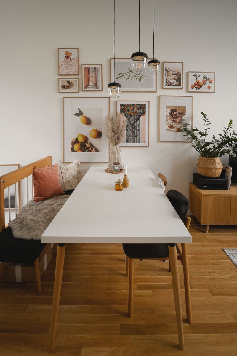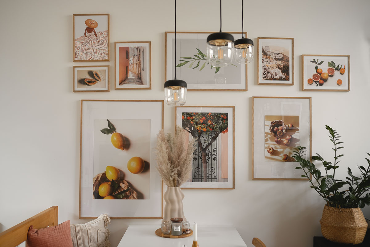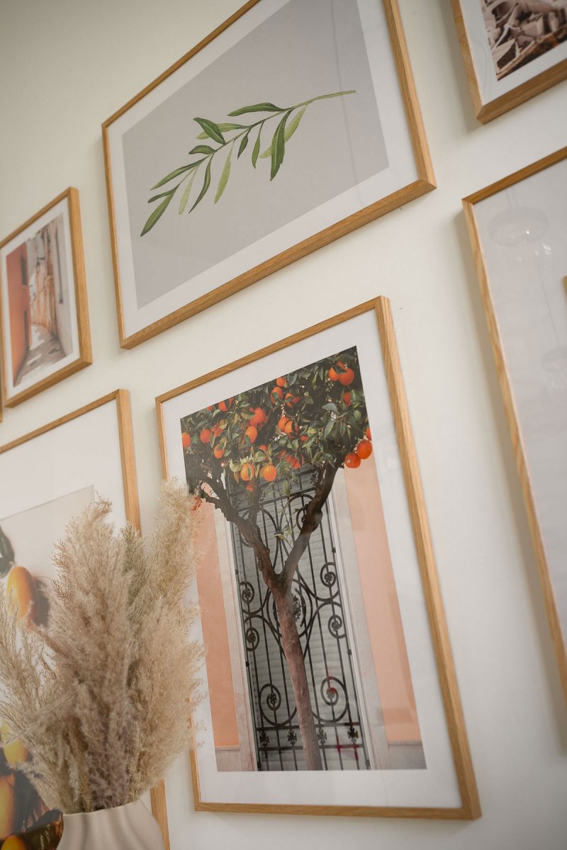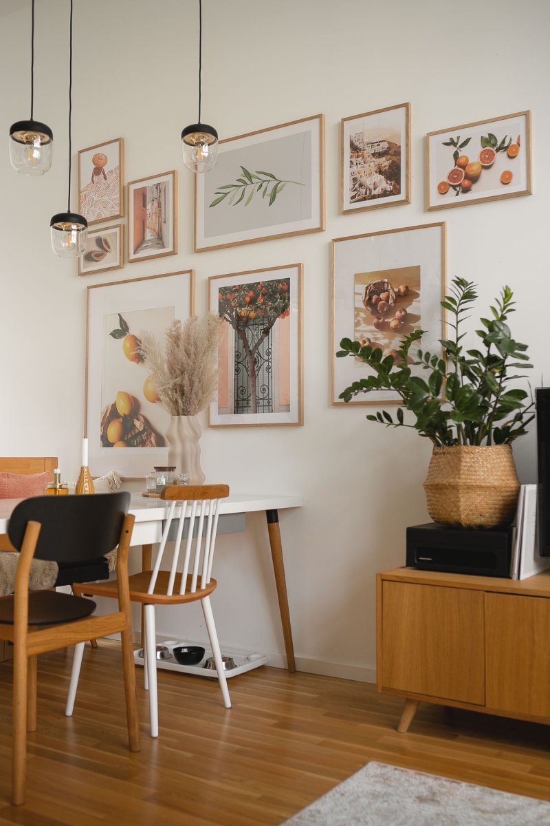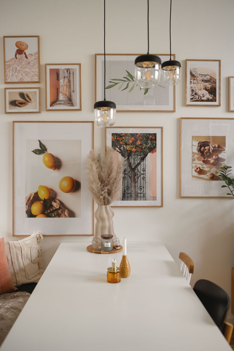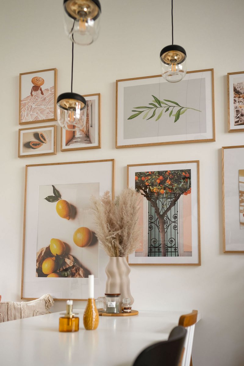 Mein Esszimmer besticht durch warme Farben. Ihr findet dort Holztöne und Farben wie Orange und Rosa. Deshalb habe ich mich bei der Auswahl meiner Bilderwand für eine Farbpalette aus Orange, Gelb, Rosa und Grün entschieden. Ich war auf der Suche nach farbenfrohen Bildern, die Sommer Feeling versprühen und gute Laune machen. Was sagt ihr, ist es mir mit meiner Bilderwand gelungen?