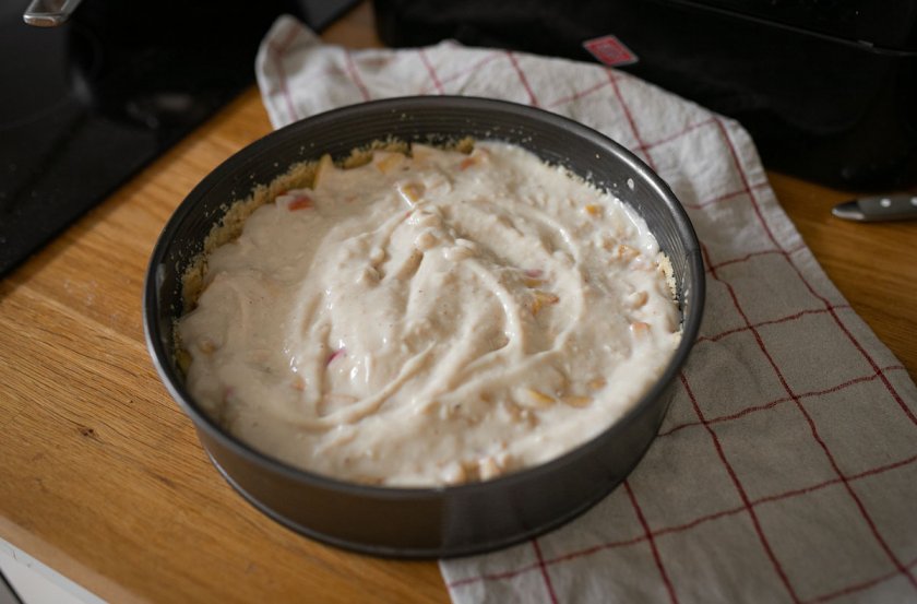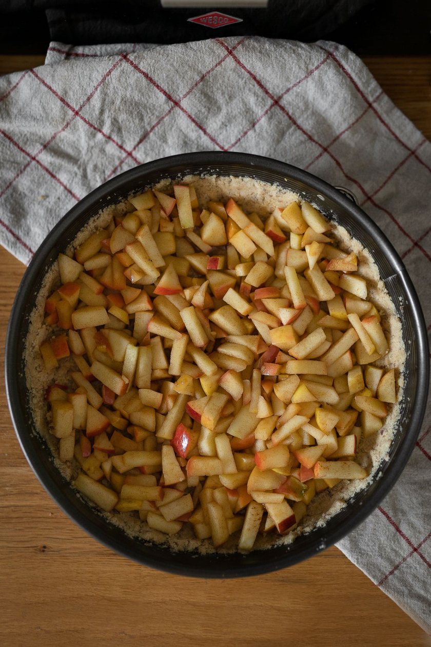- In der Springform zuerst die Äpfel auf den Teig verteilen.