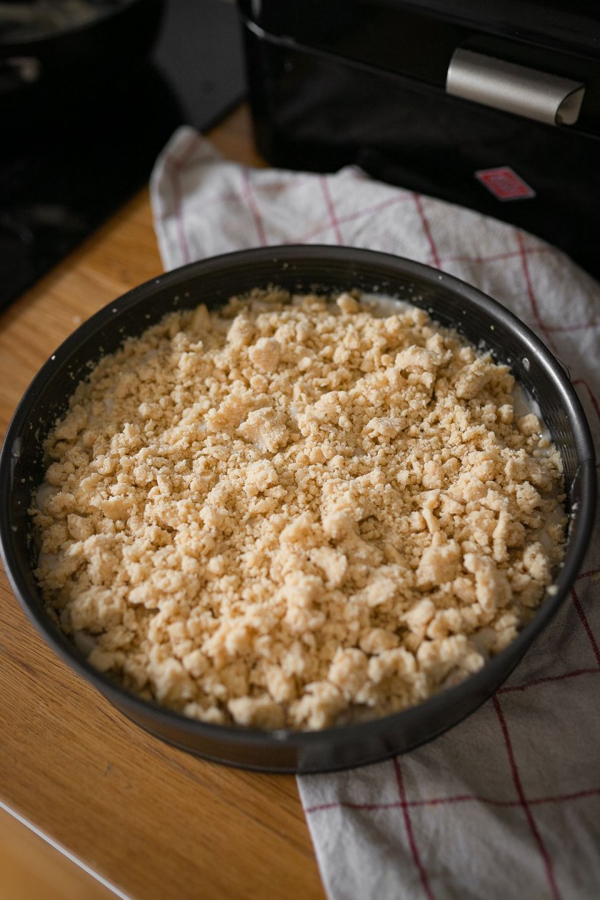 Zubereitung des veganen Apfel-Streusel-Pudding-Kuchens