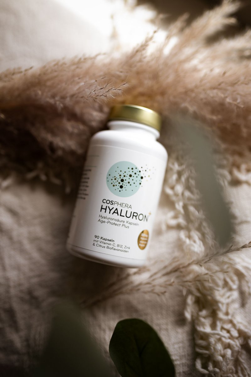 Bei dem ersten Produkt von Cosphera handelt es sich um Hyaluron Kapseln in hochdosierter Form. Jede Kapsel enthält 500 mg mikro-molekulare Hyaluronsäure. Außerdem ist in dem Produkt auch noch B12 und Zink enthalten. Hyaluron ist ein körpereigener Bestandteil (Mehrfachzucker), der überall im Körper vorkommt. Eine hohe Konzentration sind im Bindegewebe, Knochen, Bandscheibe, in der Gelenkflüssigkeit und im Glaskörper des Auges zu finden. Mit zunehmendem Alter verlangsamt sich die körpereigene Produktion von Hyaluron, weshalb sie mittels Kapseln ausgeglichen werden kann. Hyaluron ist beispielsweise auf für die Elastizität und Spannkraft der Haut verantwortlich.