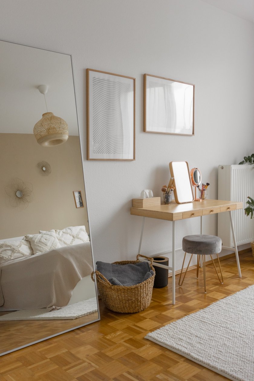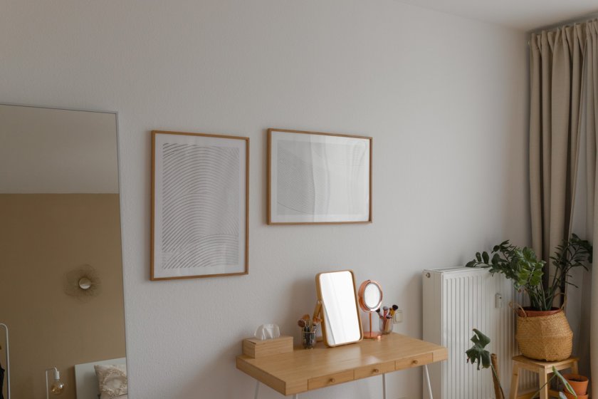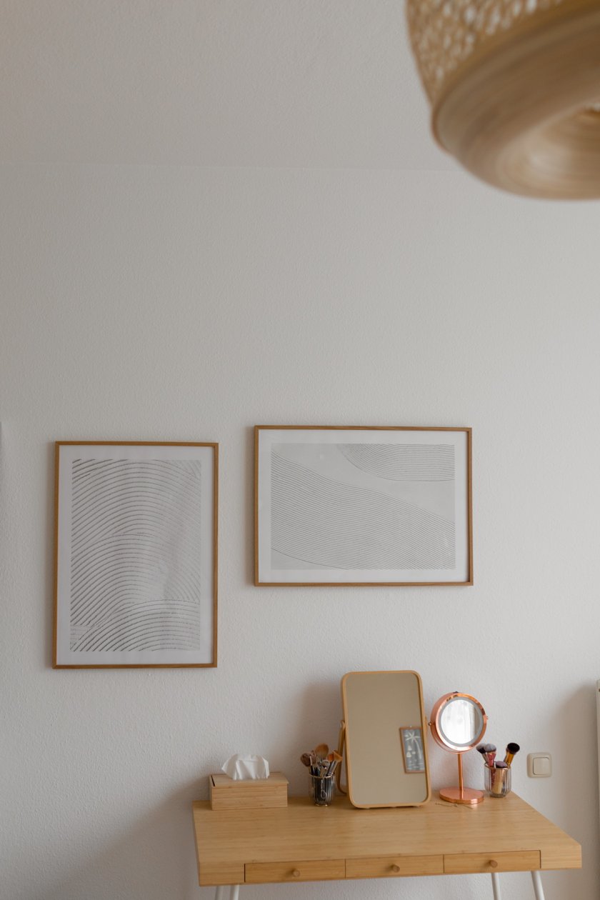 Betreten wir jetzt den nächsten Raum in meiner Wohnung, dem Schlafzimmer. Hier ist alles in warmen Tönen sowie Naturtönen gehalten. Schwarz ist nicht vorhanden und auch unerwünscht. Sanft soll dieser Raum sein und Gemütlichkeit ausstrahlen. Und genau das war mir wichtig bei der Wahl der zwei Bilder für mein Schlafzimmer. Ich habe zwei strukturierte Poster in Weiß gewählt und mit Eiche-Rahmen kombiniert. Eine sehr einfache Mischung, die für sich steht und sich dezent aber bestimmend in das Gesamtbild des Raumes einfügt.