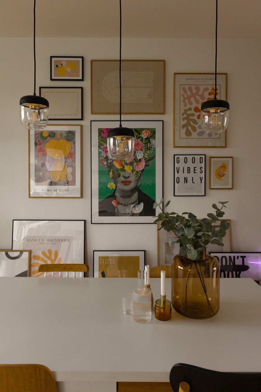 Das Herzstück der Bilderwand ist ein Kunstdruck von Frida Kahlo – schon lange möchte ich ein Werk von ihr in meiner Wohnung haben. Ich liebe ihre Arbeiten und dieses bunte Poster versprüht ab sofort gute Laune im Essbereich.