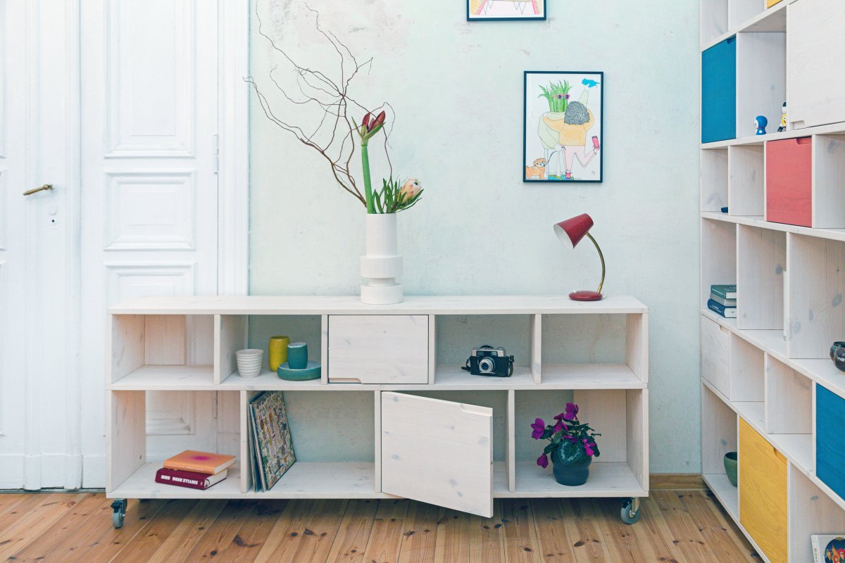 Du suchst eher nach einem Lowboard oder Sideboard für dein Arbeitszimmer? Dann kannst du dir dieses auch genauso konfigurieren. Hier lassen sich die Rollen am Regal empfehlen, die vor allem im Büro sehr praktisch sein können. Falls du außerdem doch irgendwann mehr Platz benötigen solltest, lässt sich Alma problemlos mit Hilfe von Modulen erweitern.