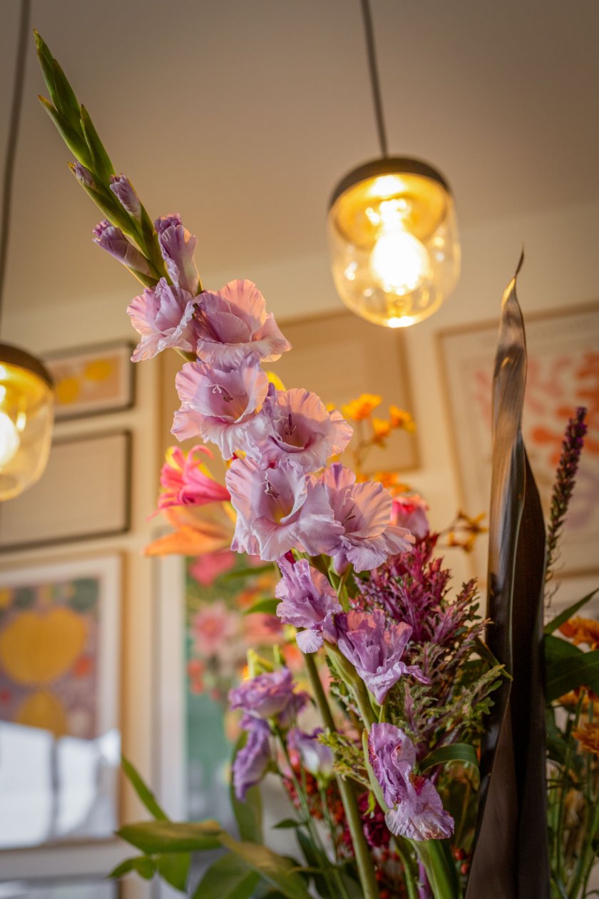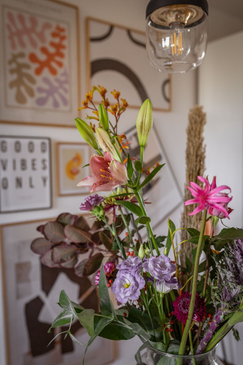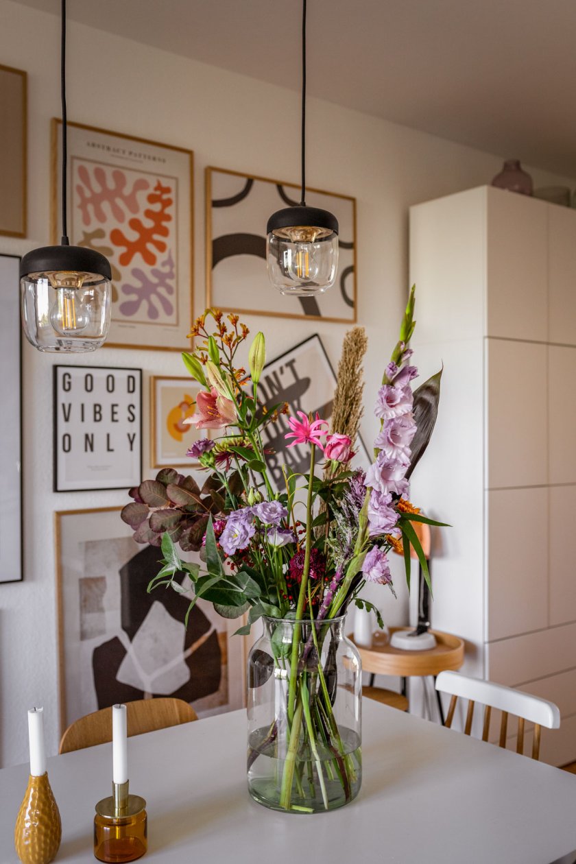 Neben den Blumen sind es auch Bilder und einige Dekoelemente, wie Vasen und Kerzen, die meinen Wohn- und Essbereich verschönern. Die Bilderwand habe ich im retro Stil kreiert. Sie ist knallig und lebensfroh und verleiht den Raum einen Eyecatcher-Moment. Genau deshalb habe ich bei dem Dekorieren von Vasen zurückgehalten. Und nur dezente Details gesetzt.