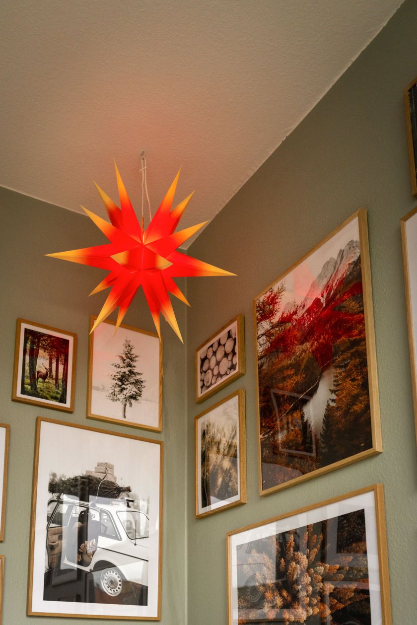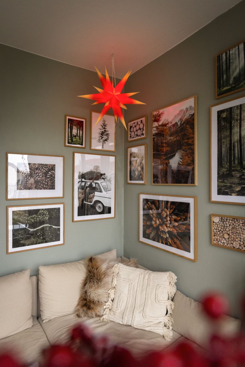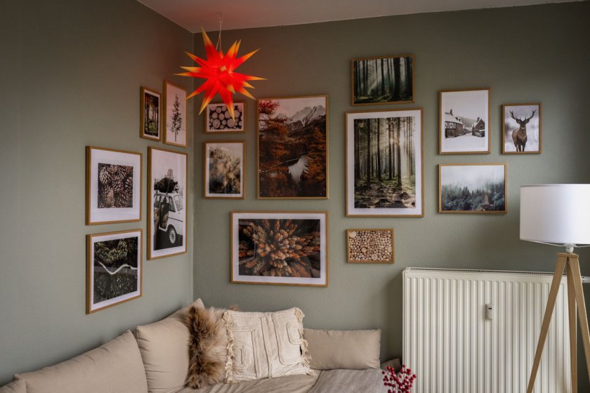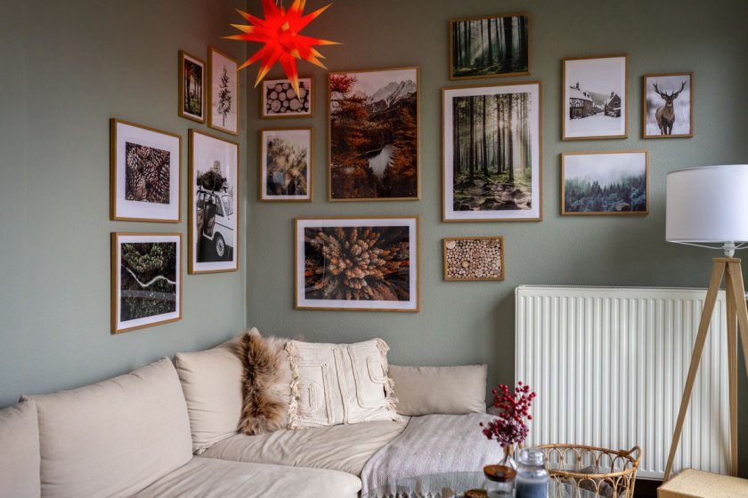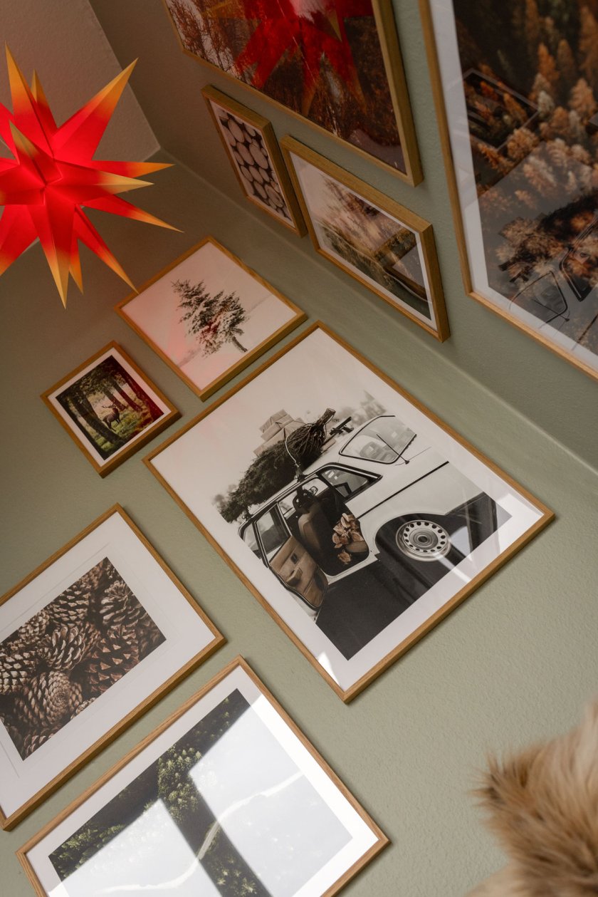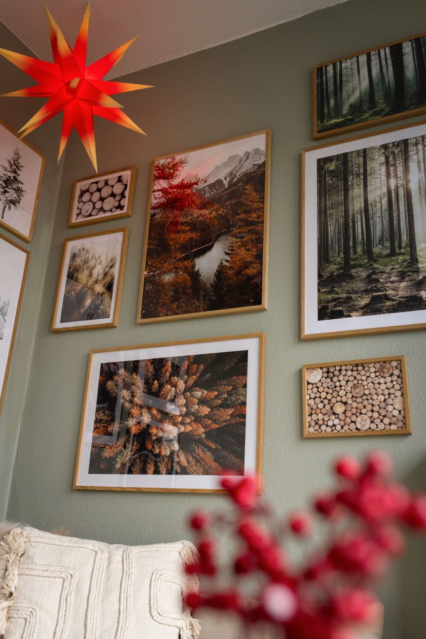 Entstanden ist ein stilvoller Mix, der mit einer Herbstlandschaft beginnt und in einem schneereichen Winter endet. So habe ich in meiner Kindheit die Winter erlebt. Was wohl auch erklärt, warum ich den Winter so sehr liebe wie den Sommer. Die entstandene Bilderwand macht mein Wohnzimmer gemütlich. Die kahle Wand ist Geschichte – zum Glück. Mein Wohnzimmer ist zum liebsten Ort am Abend geworden. Ich genieße die Zeit dort mit meinen Katzen Lillie und Lenny sehr gerne bei einem guten Buch. Kaum zu glauben, wie viel Bilder für das Wohlfühlen bewirken können.