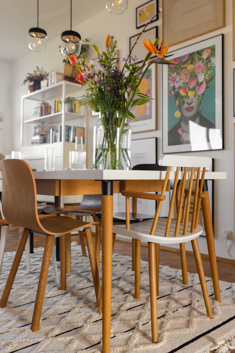 Die Wahl der richtigen Holzart bemisst sich an deinen Präferenzen. Ich liebe Massivholz aus Eiche, denn es hat einen warmen Unterton und ist weder zu hell noch zu dunkel. Bei der Wahl der richtigen Holzfarbe spielt aber auch der Boden sowie die von dir gewählte Wandfarbe eine große Rolle. In meinem Fall habe ich mich für einen Esstisch mit weißer Massivholzplatte und eichefarbenen Beinen entschieden, weil der Tisch dadurch nicht so üppig wirkt. Er gliedert sich dezent in den Raum ein und gibt ihm Luft und Weite.