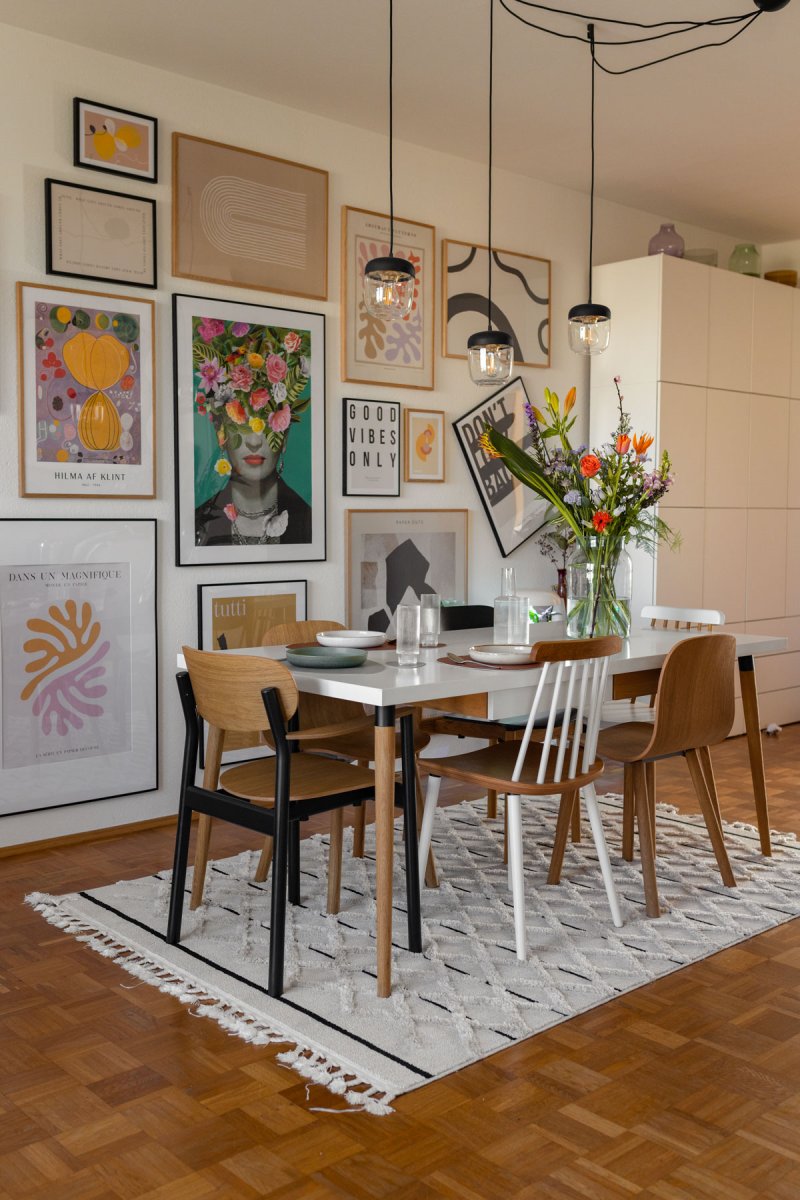 - Bilderwand: So ausgefallen wie die Blumen ist ebenso die künstlerische Bilderwand, die sich über den ganzen Essbereich erstreckt.