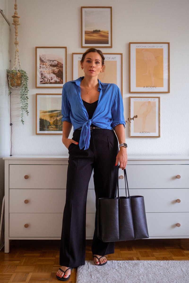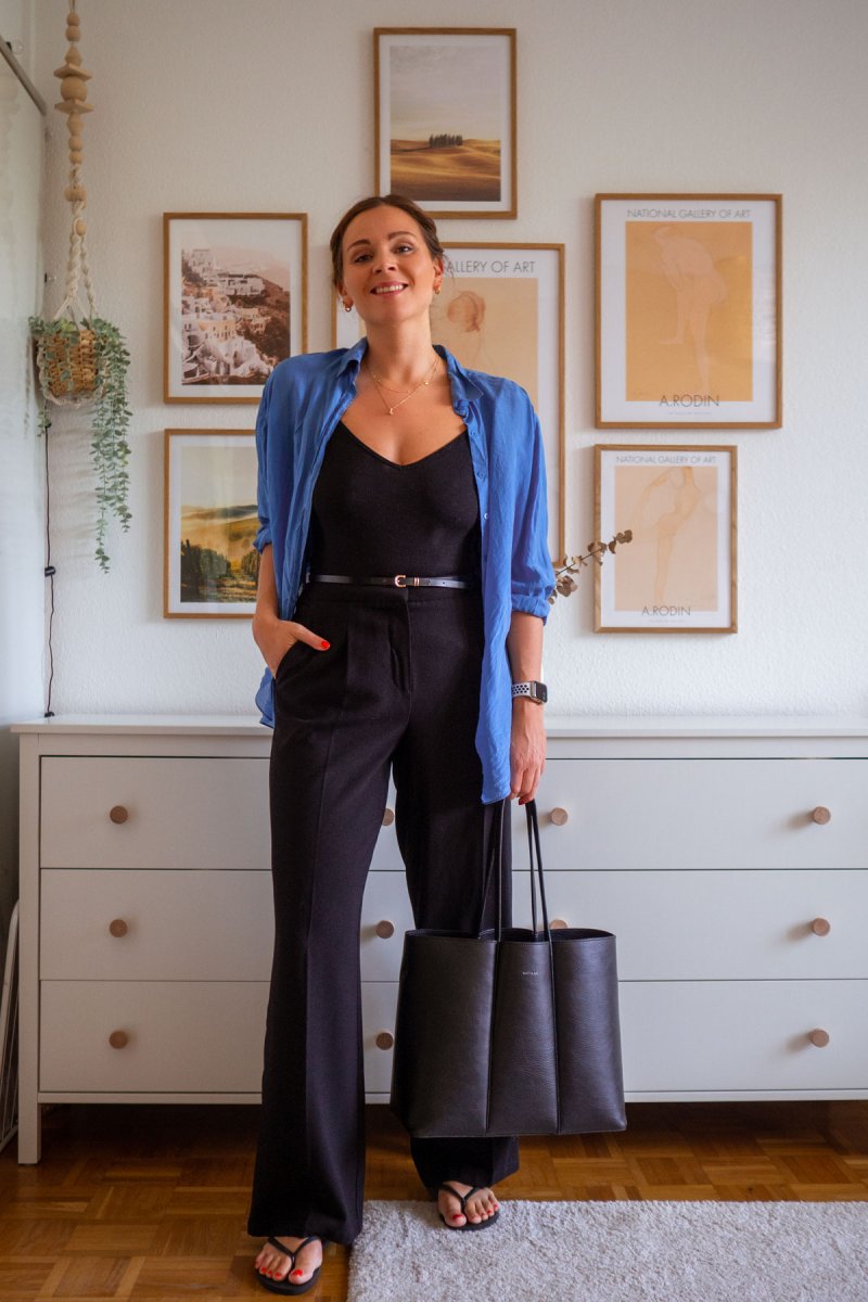 Alltags Outfit #1: Schwarze Marlene Hose, schwarzer Body und luftige Hemdbluse