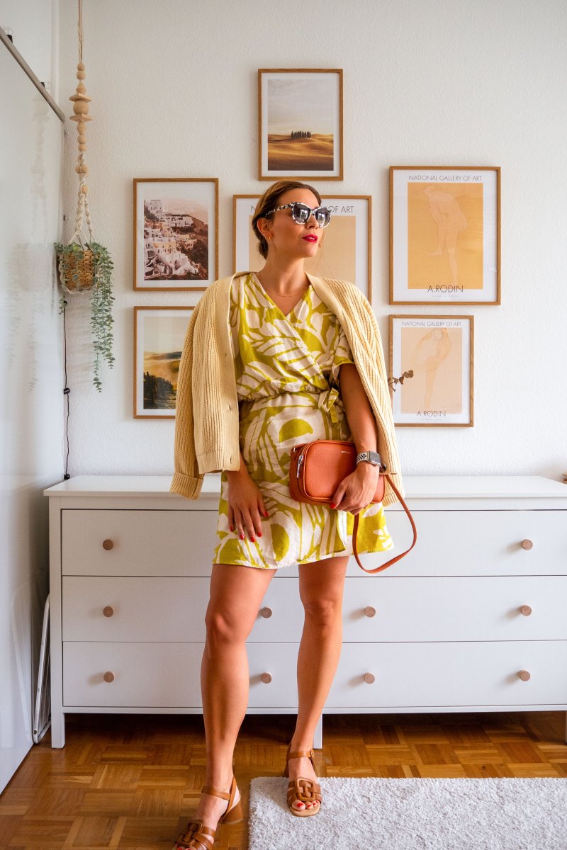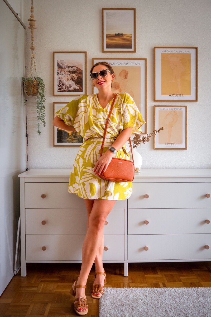 Der nächste Style schreit nach Farbe und guter Laune. Ich habe bei meinem zweiten Alltagsstyle auf ein Printkleid in knalligem Gelb gesetzt. Dazu trage ich eine orange Tasche und eine ausgefallene Sonnenbrille von Stella McCartney – die mich über Jahre schon begleitet. Ich liebe diese Brille über alles. Sie ist genau die richtige Mischung aus ausgefallen und tragbar.