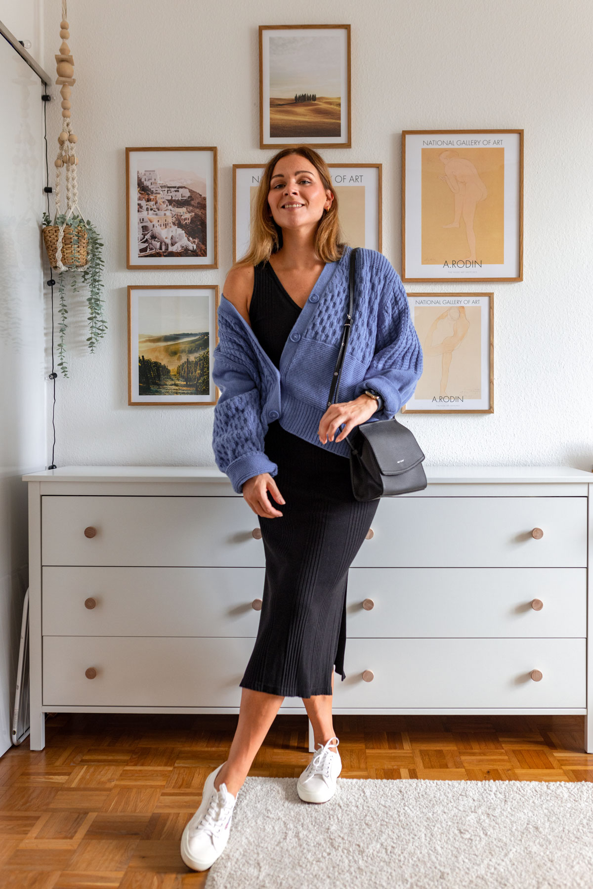 Herbst Outfits #2: schwarzes Midikleid, weiße Supergas und blaue Strickjacke