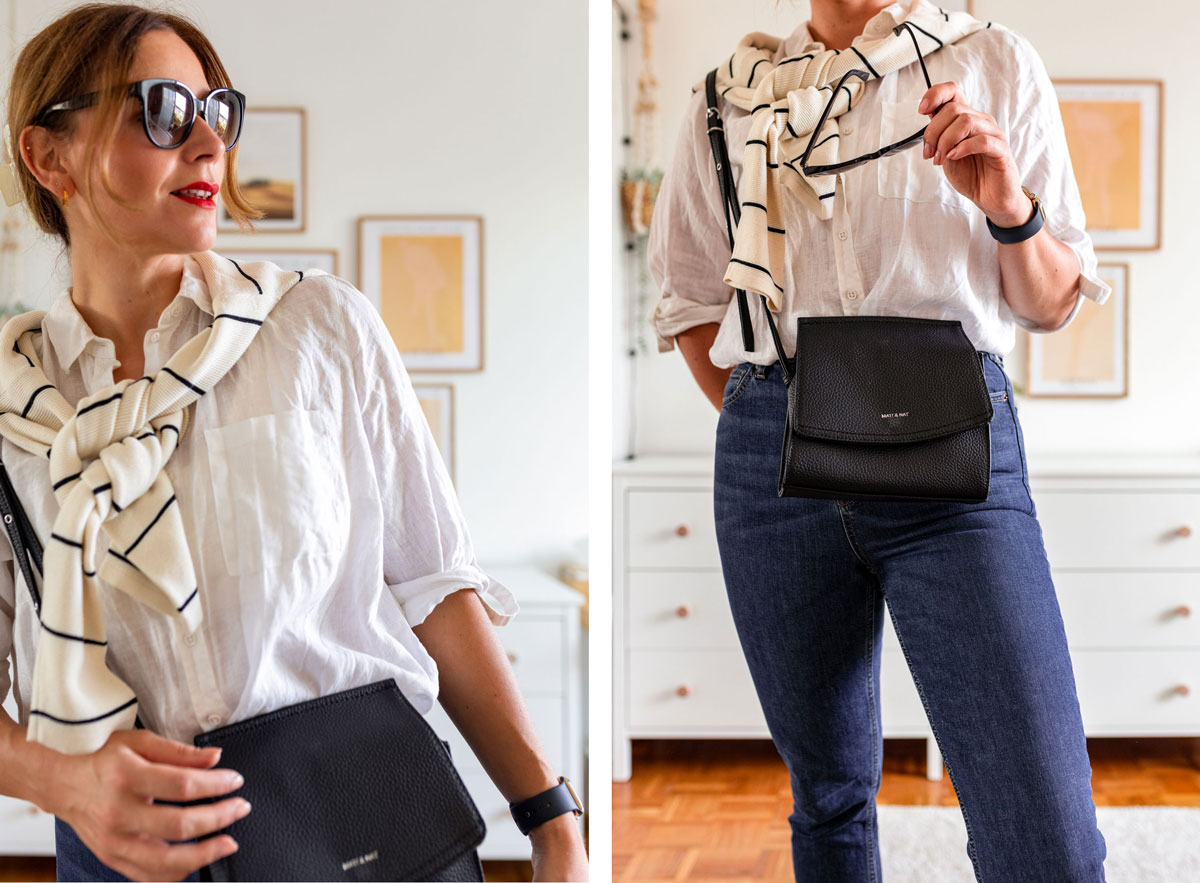 Herbst Outfits #3: lässiger Jeans Look mit Matt & Nat Tasche, gestreiften Armedangels Pullover und weißer Bluse