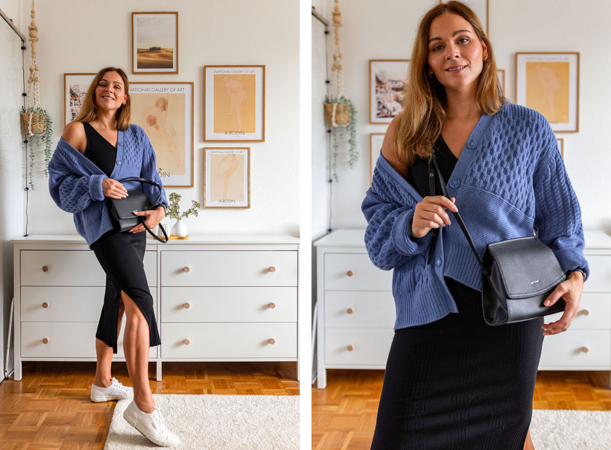Herbst Look Nummer zwei setzt auf dem Bodycon Trend, der in aller Munde ist. Dabei handelt es sich um figurbetonte Kleider, die eng am Körper anliegen. Ich style diesen Trend gekonnt mit einem schwarzen Midikleid nach und kombiniere dazu eine knallblaue Strickjacke, die ich absichtlich versetzt geknöpft habe. That’s it! An kühleren Herbsttagen kann das Kleid einfach mit einer Strumpfhose ausgeführt werden.