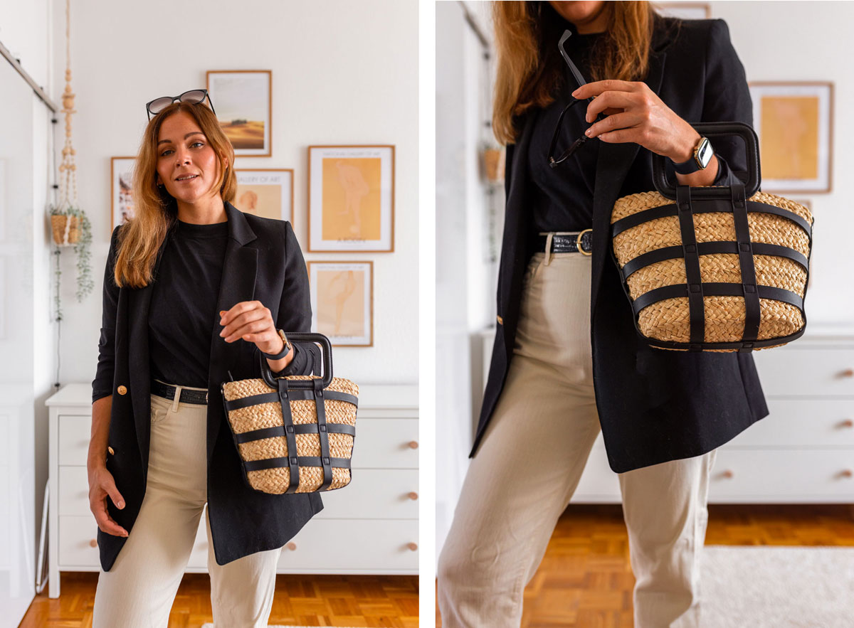 Auf die Nase habe ich meine liebste Sonnenbrille gepackt, die ich vor ein paar Jahren bei Viu gekauft habe. Ich liebe dieses Modell über alles, auch weil es zeitlos und schlicht ist. Für etwas Pep in diesem Look sorgen die schwarzen Sandalen und die auffällige Strohtasche, die das Outfit zu etwas Besonderen werden lassen.
