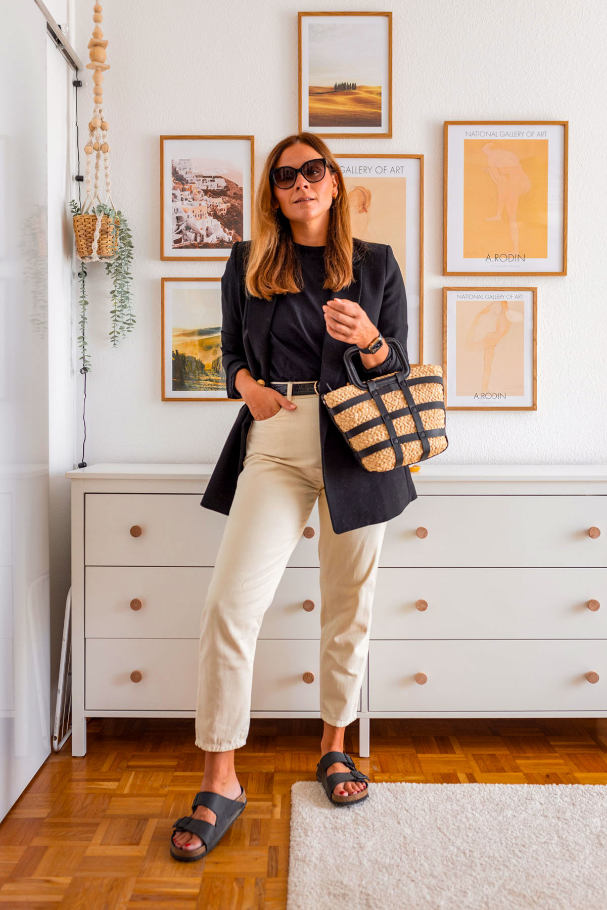 Herbst Outfits #1: Black & White Outfit mit schwarzen Blazer, weißer Jeans und Armedangels Shirt