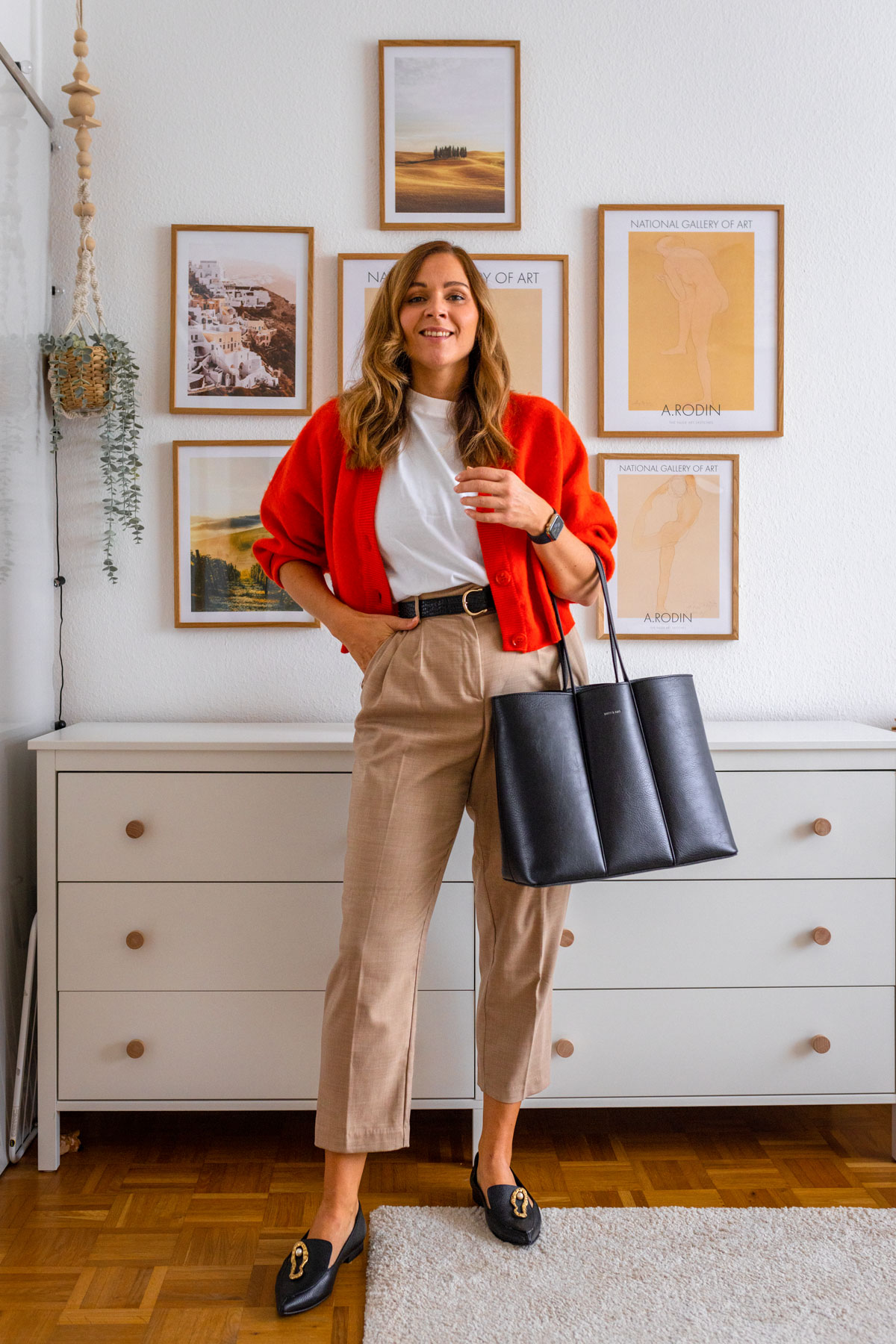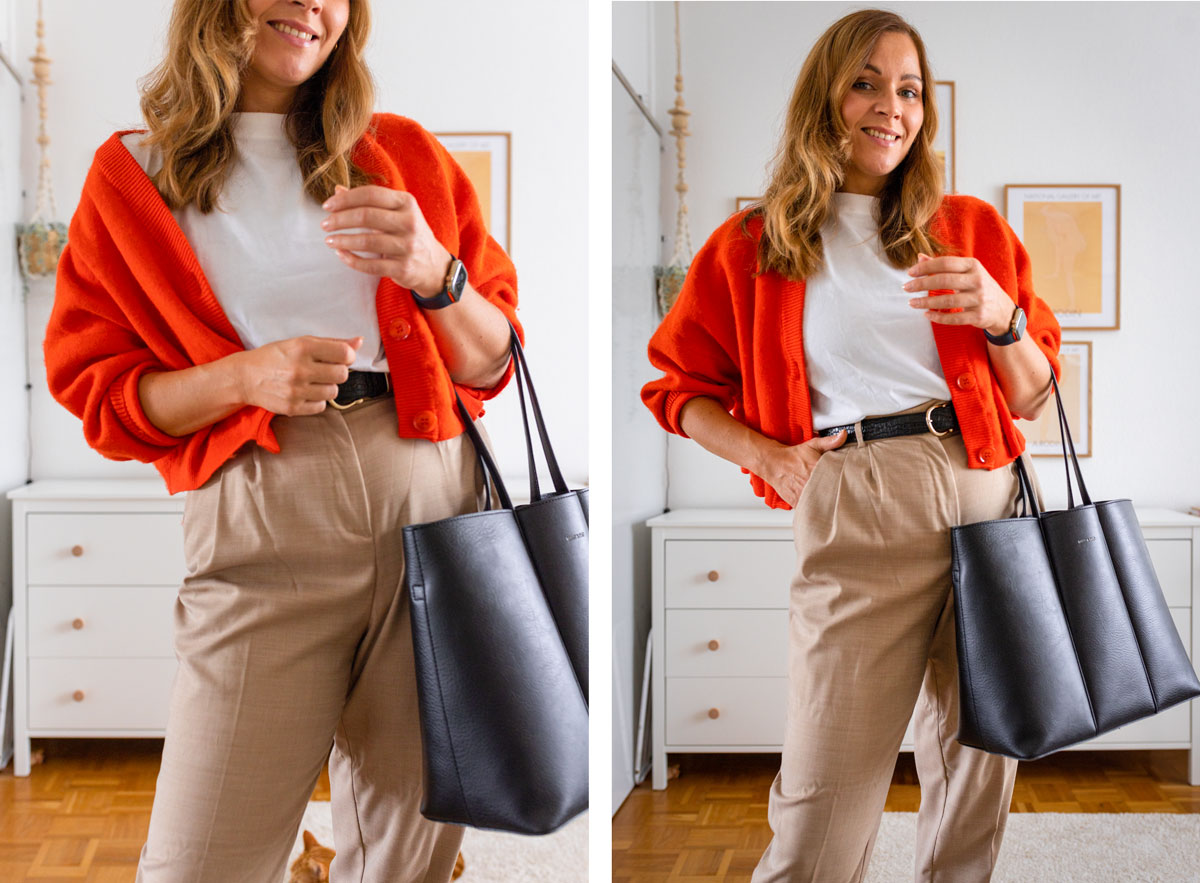 Dieses Outfit ist meine erste Wahl für die warmen Spätsommertage. Die elegante Chino kann ohne Weiteres mit dem weißen Shirt solo ausgeführt werden. Für mich ist das so ein „typischer“ Everyday-Style, den ich mit den passenden Teilen je nach Stimmung aufhübsche. Heute war mir nach Farbe und ich habe zu dem schlichten Outfit eine knallige Strickjacke ausgesucht. Passend dazu wähle ich rein schwarze Accessoires. Meinen liebsten Shopper, einen eleganter Slipper und einen schwarzen Gürtel bilden einen starken Kontrast. Ein gemütlicher und schicker Style, mit dem man sich im Alltag sehen lassen kann.