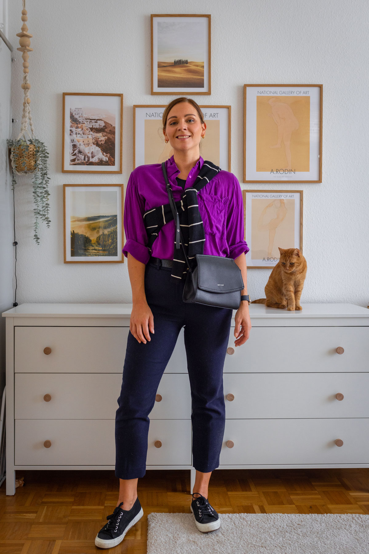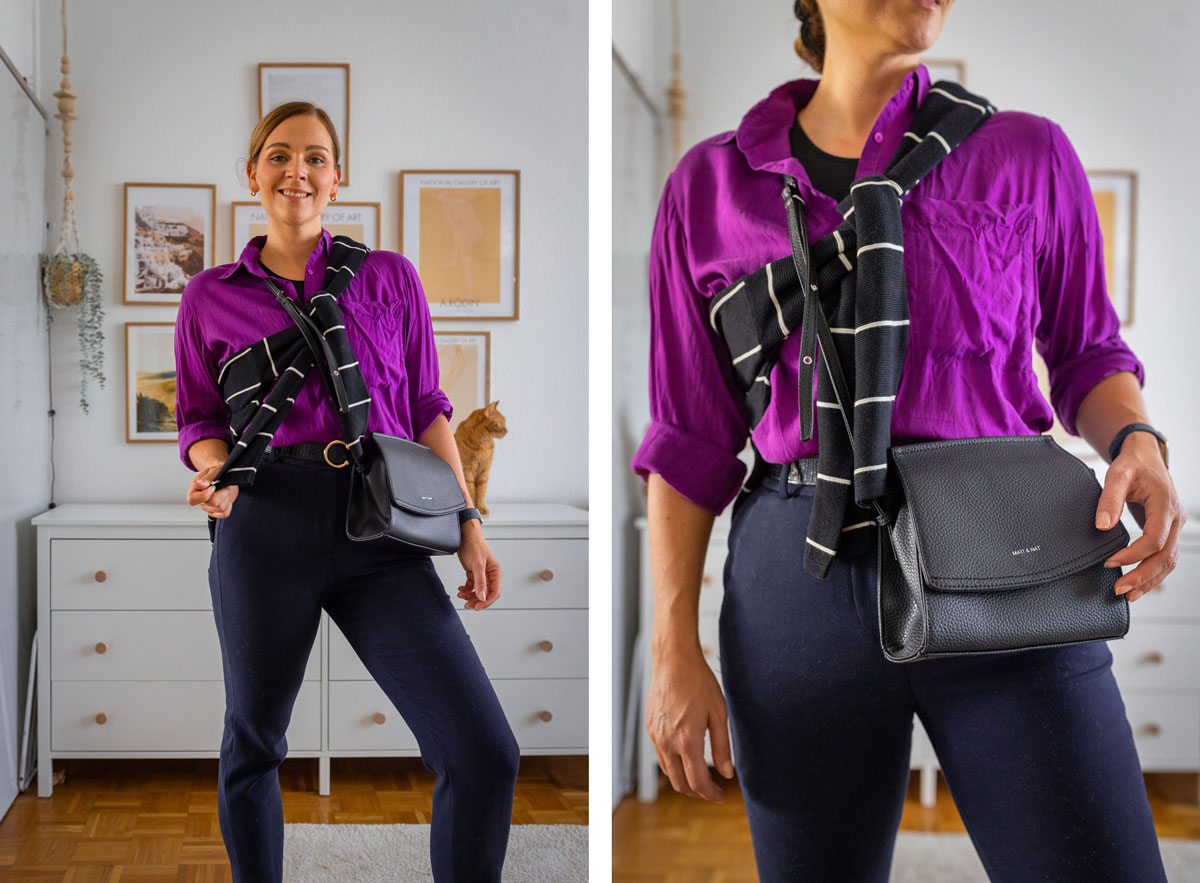 Zu der Bluse trage ich eine dunkelblaue Hose. Denn mit Beginn des Herbstes kommen auch die unterschiedlichen Hosenmodelle wieder vermehrt zum Einsatz. Diese hier hat eine schnittige Länge und harmoniert deshalb supergut mit den schwarzen Freizeitschuhen. Über die Schulter gebunden, trage ich noch einen gestreiften Pullover und passend dazu eine schwarze Tasche. In dem Sinne sage ich für heute auch goodbye, denn in diesem Look entlasse ich mich jetzt in das wohlverdiente Wochenende.