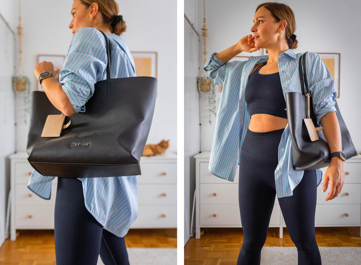 So habe ich es auch diese Woche in diesem Look getan. Zu dem Work-out-Bra und der Leggins habe ich ein Oversize Hemd kombiniert und es lässig offen getragen. Passend dazu wähle ich schicke weiße Socken und schwarz-weiße Sneakers von Adidas. Mit einem großen Shopper wird der Look komplettiert und los gehts zum Work-out! Oder ihr führt den Style einfach so aus, denn alltagstauglich ist er alle Male.