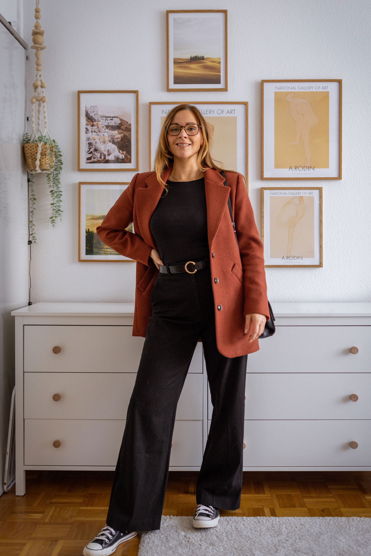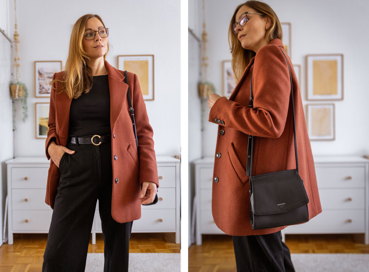 Dazu kombiniere ich ein schwarzes Shirt, eine schwarze Stoffhose und einen Gürtel, der dazu dient, den Look nicht ganz so einheitlich wirken zu lassen. Ebenfalls mit dabei ist meine geliebte Tasche von Matt & Nat, die ihr schon aus einigen Outfit Beiträgen hier auf dem Modeblog kennt. Auf die Nase habe ich mir meine Gucci Brille gesetzt, dieses zeitlose Gestell wird wohl nie aus der Mode kommen. Ich denke, ich werde es noch auf der Nase tragen, wenn ich alt und grau bin – irgendwie eine schöne Vorstellung.