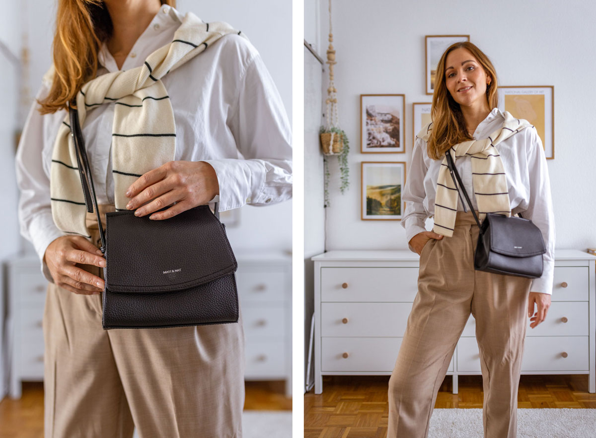 Abgerundet wird mein Outfit mit zwei schwarzen Accessoires. Zum einen die kleine Schwarze von Matt & Nat und zum anderen schwarze Slipper. Und fertig ist der Look. Mode kann so einfach sein und doch so umwerfend gut aussehen.