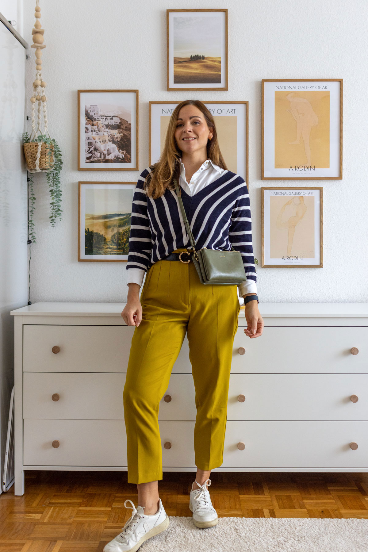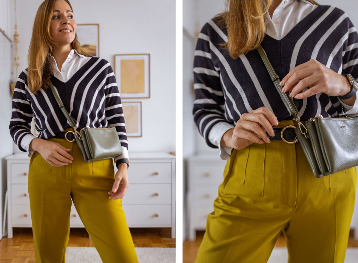 Umspielt wird sie weiterhin von einem gestreiften Pullover in Dunkelblau – habe ich euch schon gesagt, wie gerne ich die Farbe dunkelblau mag? Nein. Dann wisst ihr es jetzt. Der Pullover greift das Weiß der Bluse auf und setzt zudem einen starken Kontrast zu der senfgelben Hose. Abgerundet wird mein Style mit einer grünen Tasche und einem schwarzen Gürtel.
