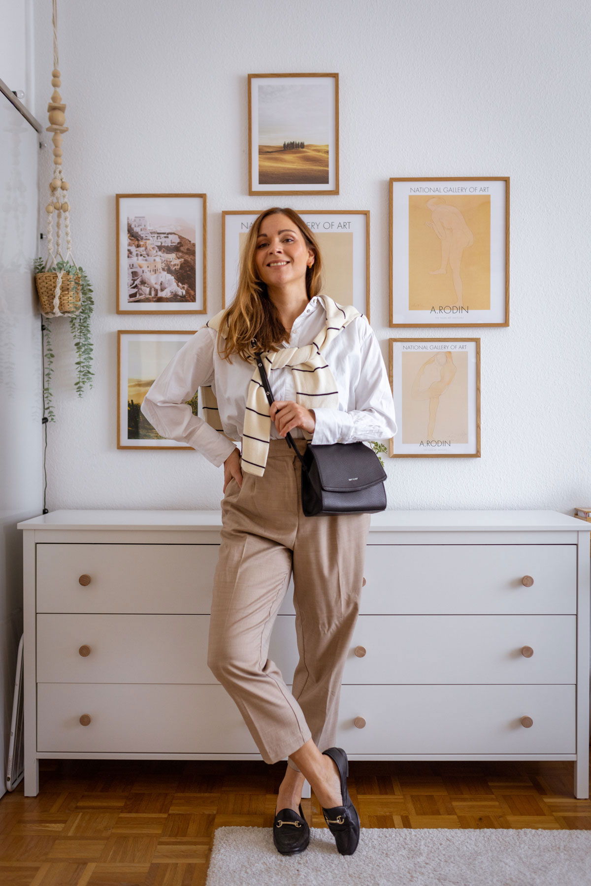 Ein Look in neutralen Tönen und etwas Kontrast, das beschreibt mein letztes Outfit sehr gut. Ich trage eine beige Bundfaltenhose zu einer weißen Bluse. Dazu setze ich einen gestreiften Pullover in Szene. Dieser kann je nach Temperatur übergezogen werden oder einfach locker auf den Schultern sitzen – so ich ihn heute trage.
