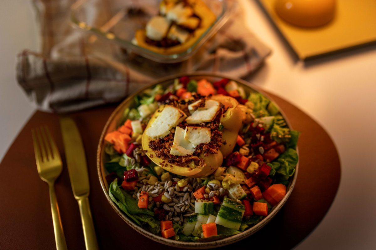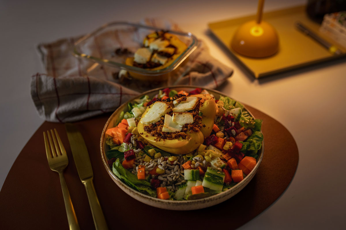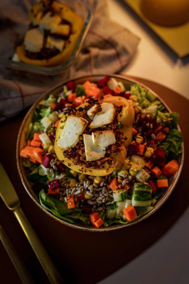 - Die Paprika mit dem veganen Hackfleisch füllen und mit dem Feta bedecken.