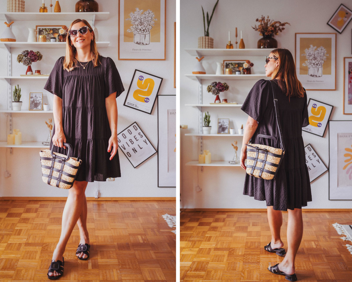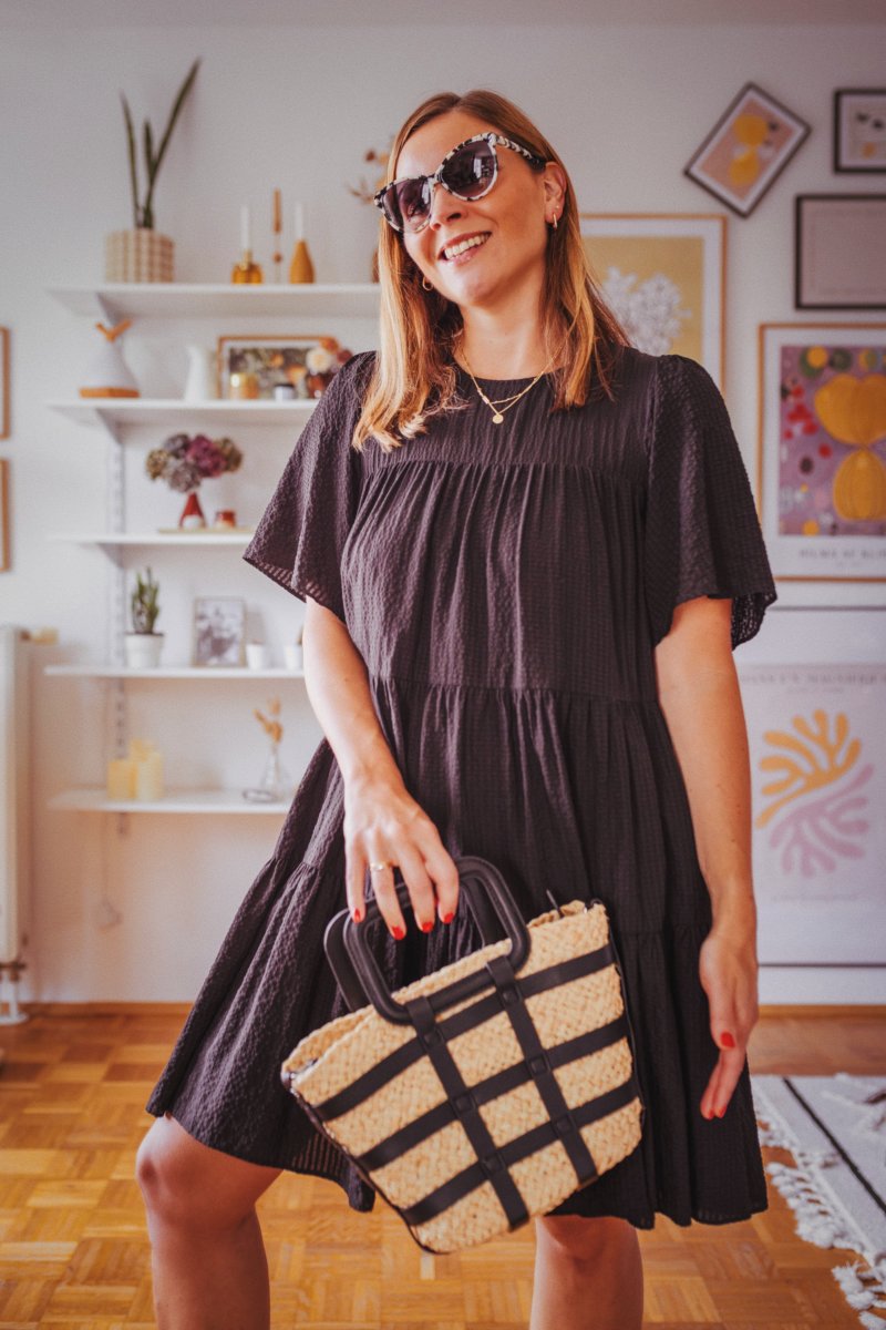 Das Schwarz einer der Modetrends 2023 habe ich euch schon in diesem Beitrag verraten. Heute kombiniere ich zu einem schwarzen Kleid, flache Sandalen und eine auffällige Sonnenbrille sowie eine richtig coole Strohtasche, die auch das Thema Schwarzweiß noch einmal aufgreift.