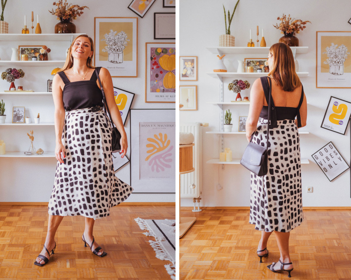 Mit einem Schwarz-weiß-Look könnt ihr nie etwas falsch machen. Ich liebe solche Styles im Sommer über alles und habe deshalb ein ganz klassisches Outfit für euch im Gepäck. Der Look setzt auf einen Midirock mit geometrischem Print, der für jede Menge Aufmerksamkeit sorgt. Dazu kombiniere ich unifarbene Teile in Schwarz, die den Style gekonnt und stilvoll abrunden.