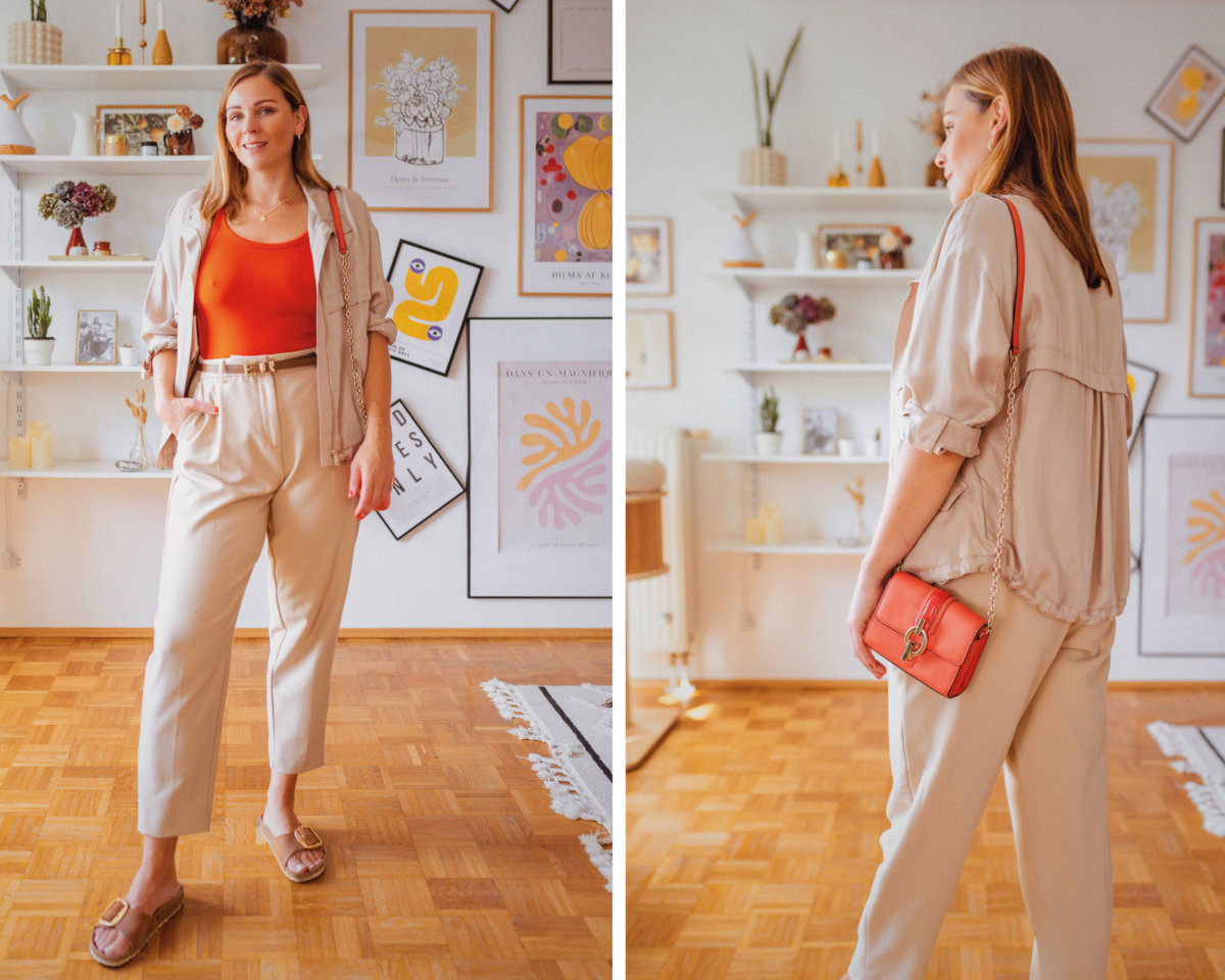 Das zweite Outfit setzte auf beige Akzente. Ich liebe die helle Farbe im Sommer sehr und trage sie auch regelmäßig aus. Dazu kombiniere ich ein auffälliges Top in meinem perfekten Rot und die kleine Tasche von Diane von Fürstenberg, die ich euch schon in unzähligen Outfits gezeigt habe. Mit von der Partie ist auch eine Blouson-Jacke, die den Look komplettiert.