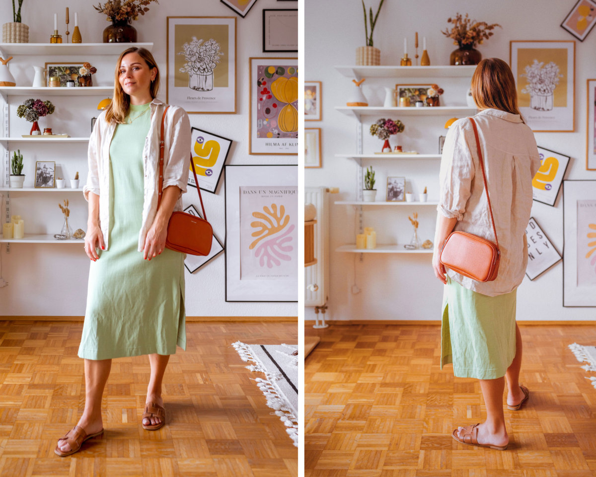 Midikleider sind im Sommer bei mir ein Muss. Dieses wunderschöne Modell in Grün habe ich im letzten Jahr ergattert und liebe es. Es macht einfach eine gute Figur, egal zu welchem Anlass es ausgeführt wird. Dazu trage ich ein beiges Leinenhemd, welches den Look etwas auflockert und an den Füßen setzte ich auf braune Sandalen.