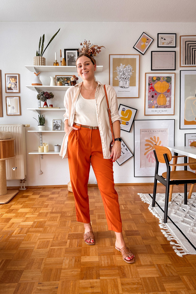Ein knalliger Look mit quietsch orangen Farbnuancen darf natürlich in diesem Sommer auch nicht fehlen. Zu der bequemen, oversized Hose kombiniere ich ein Hemd in einem Beigeton und braune Sandalen. Der Look ist allem in allem in warmen Farben gehalten, für die ich gerade besonders schwärme.