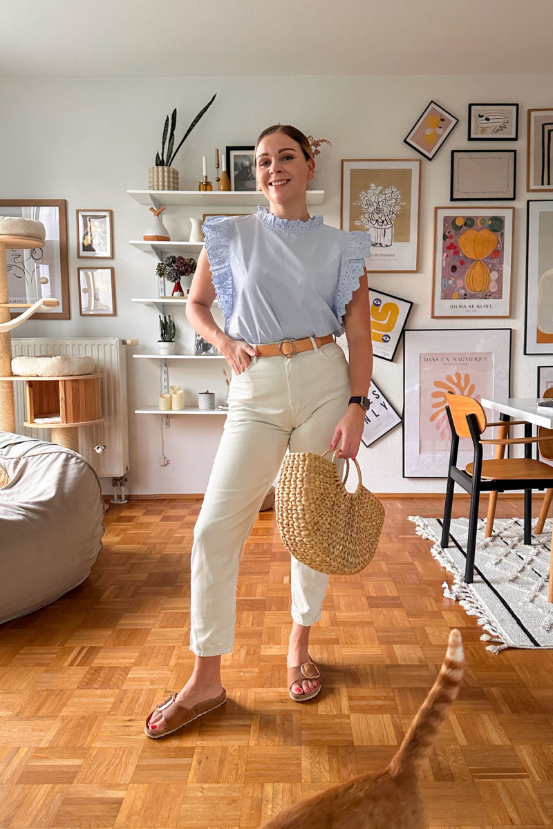 Alltagsoutfit 6: weiße Jeans, Birkenstocksandalen und Rüschenbluse