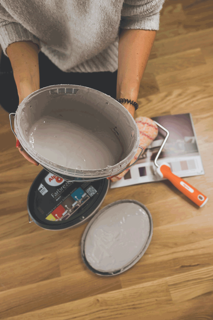 Kleiner Tipp: Ich trage die Farben immer von außen nach innen auf. Für die Kanten verwende ich einen Pinsel und für große Flächen eine Malerrolle. Wenn du zum ersten Mal streichst, solltest du darauf achten, dass du genug Produkt verwendest und keine weißen Stellen mehr zu sehen sind. Hat doch nicht alles beim ersten Auftrag gedeckt? Kein Problem! Streiche einfach nach der angegebenen Trockenzeit noch einmal über die weißen Stellen und fertig.