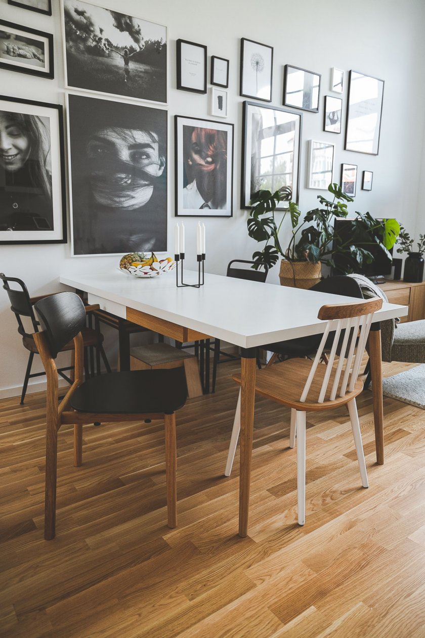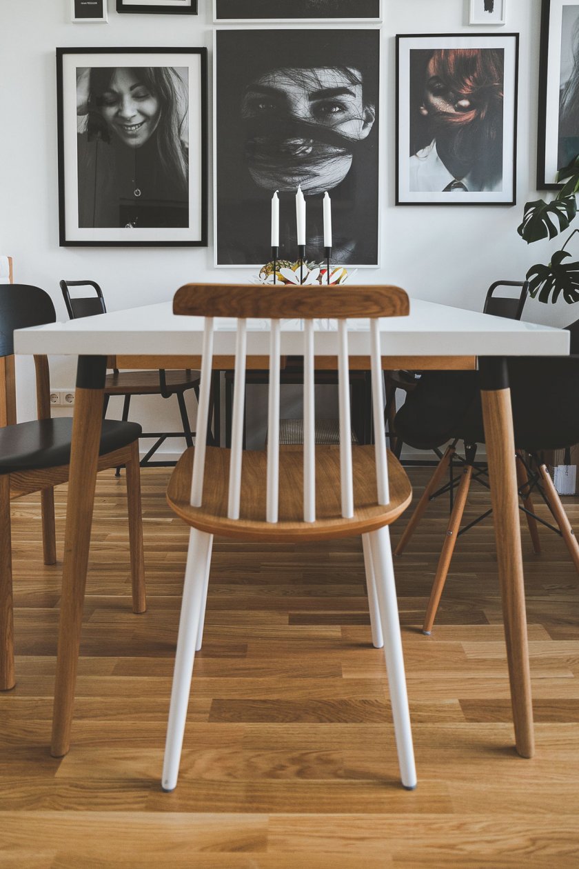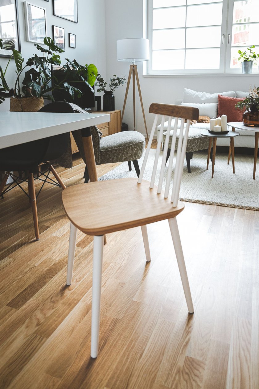 Bei der Gestaltung der Stühle habe ich wieder das Farbkonzept auf meinem Wohn- Essbereich aufgegriffen. Bei STYNG habe ich mich für einen Mix aus Weiß und Eiche entschieden – hingegen bei PRYME auf einen Mix aus Schwarz und Eiche gesetzt. Ich liebe den wilden Mix an meinem Esstisch so sehr und finde, dass das unterschiedliche Design der Stühle den Wohn-Essbereich auf eine wundervolle Weiße vervollständigt.