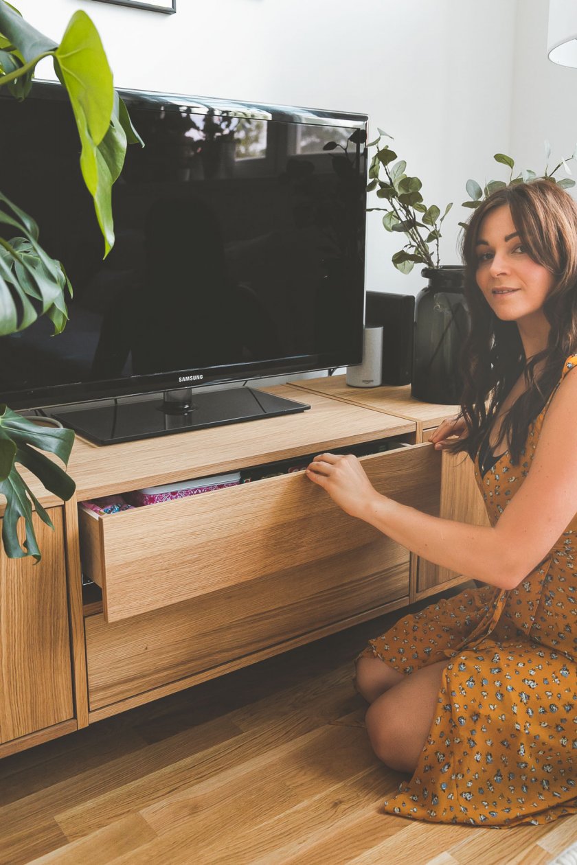 Der erste Neuzuwachs, den ich dir jetzt vorstellen möchte, ist das GRYD Lowboard von MYCS. Dieses habe ich ganz in Eiche und mit Schubladen und Türen geschlossen gestaltet. Stauraum ist einfach alles und ich mag es in meinen vier Wänden gerne clean und ordentlich.