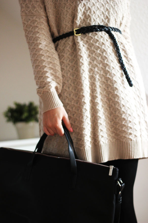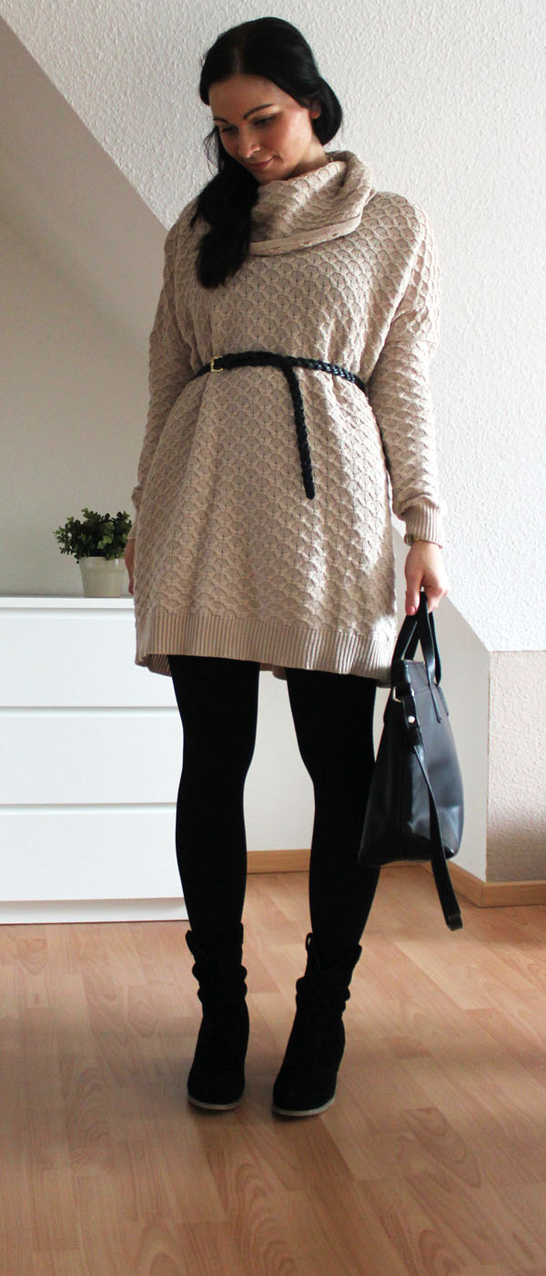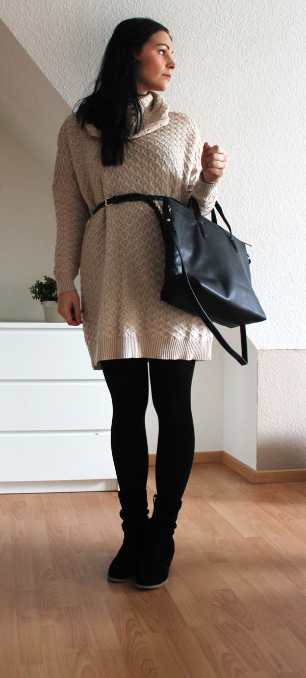 Nicht verwunderlich, dass mein heutiges Outfit bequem und casual ist. Den Pullover habe ich letztes Jahr im Sale bei H&M ergattert. Aktuell auch wieder in der Winterkollektion zu haben. Er kratzt nicht, ist unglaublich bequem und hält mich Frostbeule kuschelig warm. Momentan ist er in unterschiedlichen Farben, darunter auch weinrot erhältlich. In dieser Farbe würde er vermutlich auch sehr gut aussehen, hm? Ich denke, das von mir getragene Modell auch parallel dazu im Sale gesehen zu haben. Um die Figur zu betonen wurde noch schnell ein Gürtel um die Taille geschnallt. In die Boots geschlüpft und die neue Tasche von Zara unter dem Arm geklemmt.