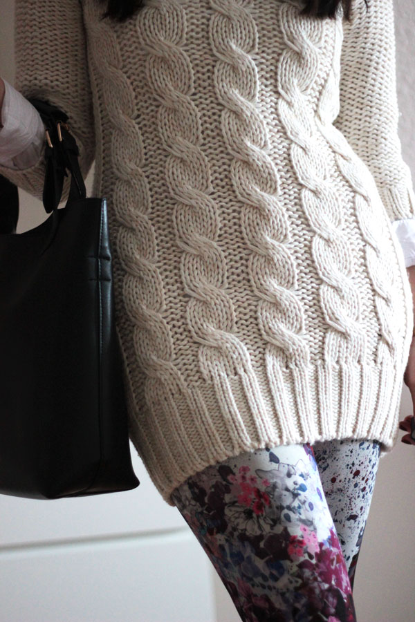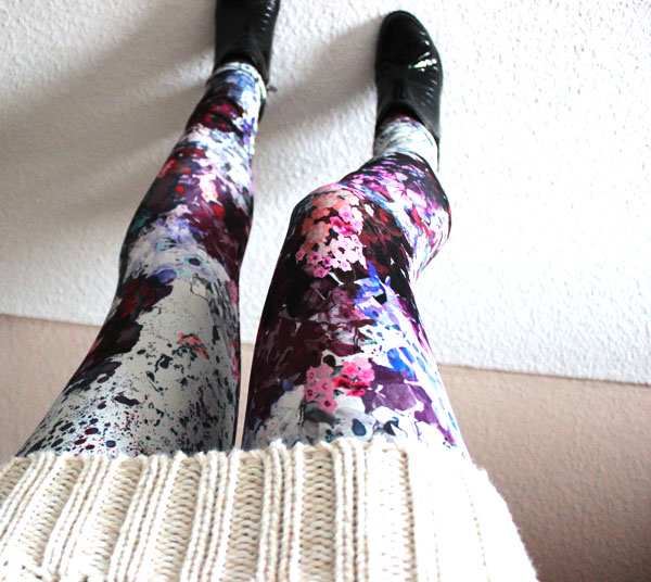Prints – bunt und auffällig trägt Frau diesen Herbst am Bein. Anfänglich etwas gewöhnungsbedürftig aber mittlerweile ist mein Herz für die farbigen Beinkleider entflammt. Mein aktueller Favorit ist die Leggings aus der H&M Lana Del Ray Kollektion. Kombiniert wird sie mit den geliebten dicken Strickpullovern, die sich in letzter Zeit in größeren Mengen in meinem Kleiderschrank angehäuft haben.