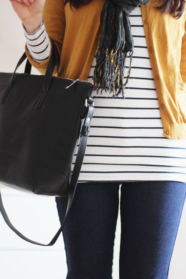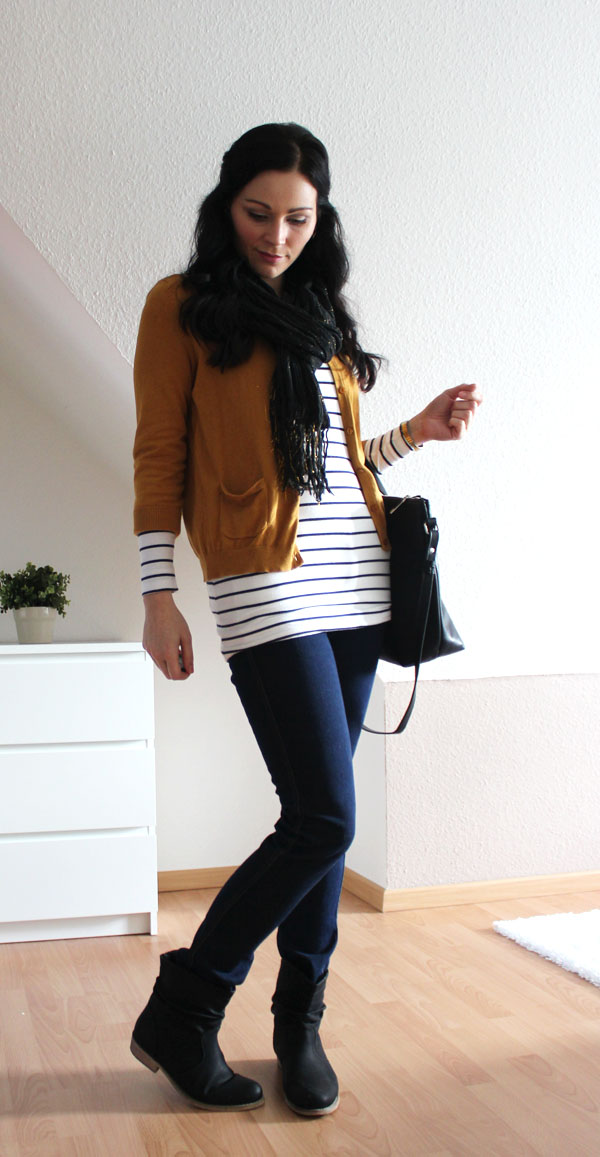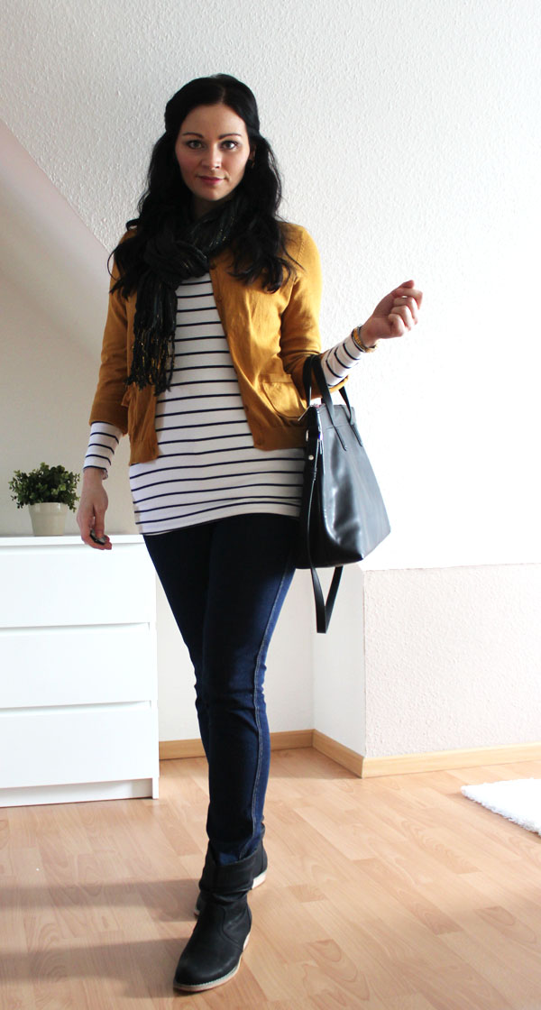 Ich trage einen Cardigan, einen Schal, eine Jeans und ein Shirt von H&M. Die Tasche ist von Zara und die Schuhe sind von Schuhtempel24. Ich liebe diese senfgelbe Farbe ebenso wie diesen Cardigan!