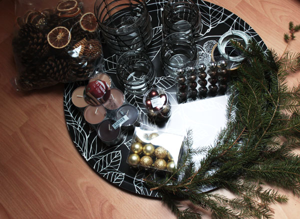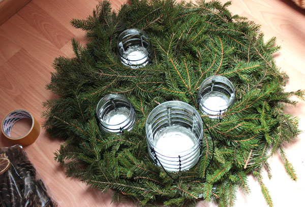 Im zweiten Schritt habe ich die Tannenzweige auf dem Tablett ausgelegt und die Windlichter positioniert. Die Tannenzweige sehr Dicht auflegen, so dass keine Flecken entstehen und man das Tablett sieht. An dieser Stelle heißt es Klotzen statt Kleckern. Seid nicht zu geizig. Je mehr Tannenzweige ihr für den Adventskranz benutzt, umso schöner das Ergebnis. Jetzt habt ihr die Grundlage eures Adventskranzes.