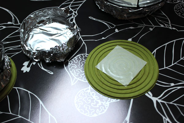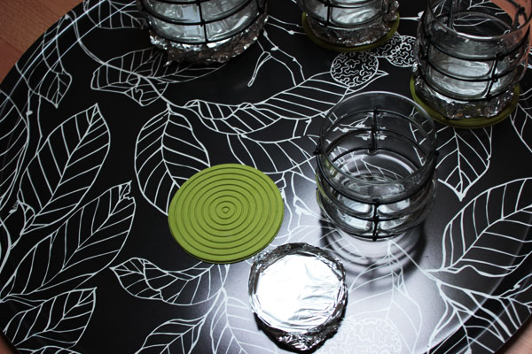 Im ersten Schritt habe ich die Windlichter mit Alufolie ausgestülpt. Dies dient zum einen als Hitzeschutz, zum anderen können Kerzen dadurch leichter entfernt und das Windlicht sauber gehalten werden. Die Windlichter habe ich zur Sicherheit auf einen Untersetzer platziert, diesen Schritt kann man ggf. weglassen. Bei mir steht Sicherheit ganz oben, sollte es bei euch auch!