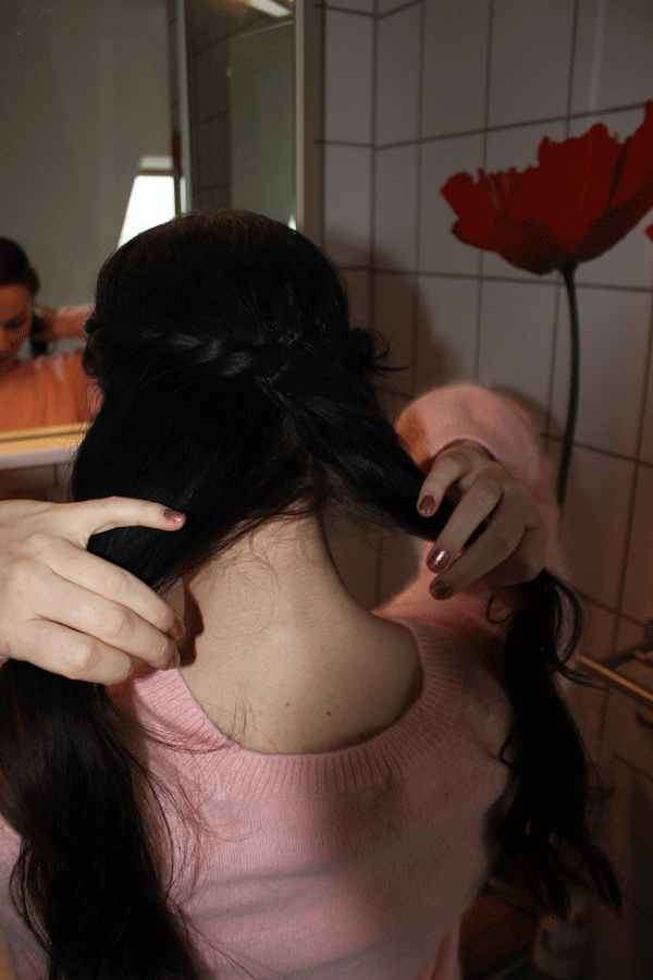 - Step: Die Haare in zwei Hälften teilen und diese zum Oberkopf hinführend zu einem Haarknoten knoten.