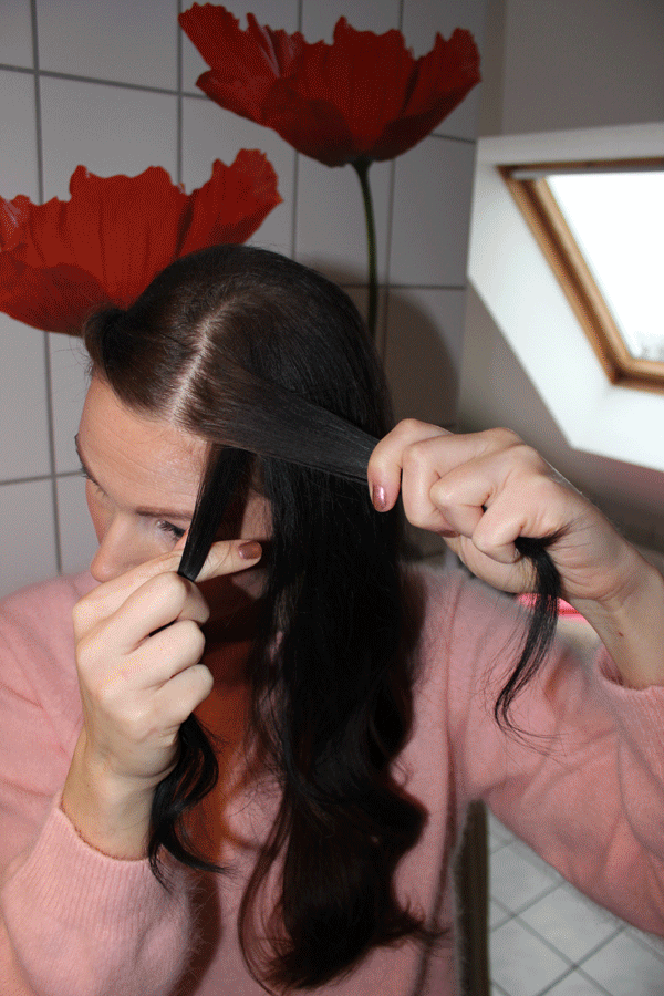 - Step: Eine neue Strähne aufnehmen und die vorherige wieder fallen lassen. Diesen Vorgang wiederholt ihr solange ihr möchtet bzw. solang euer Haar ist.