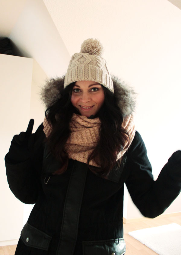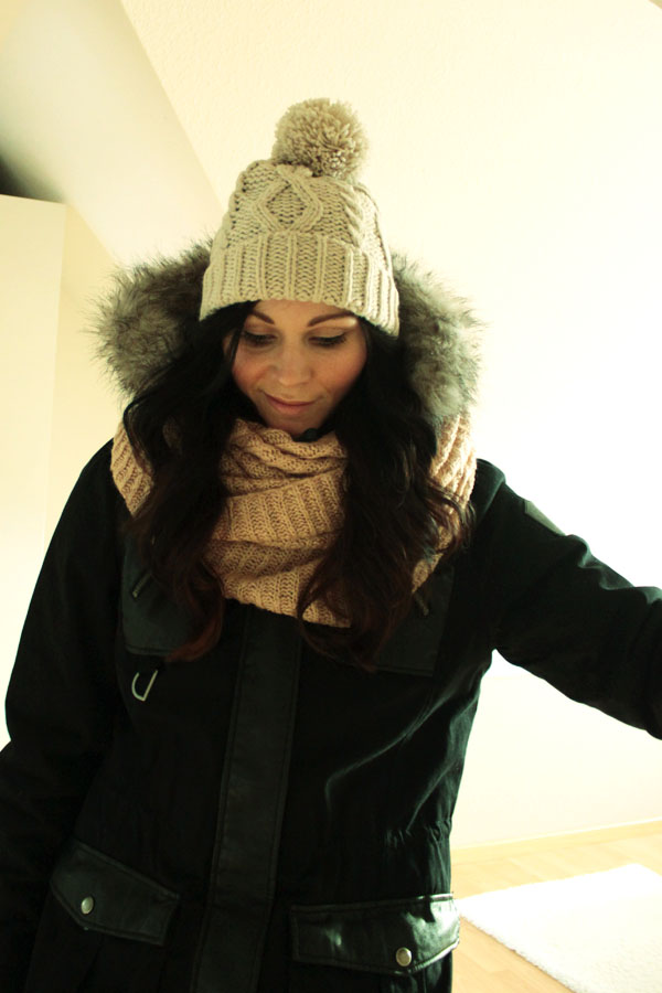 Diese Winterjacke hat mich auf den ersten Blick überzeugt. Was mir besonders gut gefällt ist die Verarbeitung von Stoff und Lederimitat. Darüber hinaus hält sie selbstverständlich schön warm und bietet eine Kapuze, die Regen und Schnee abhält. Was will Frau mehr. Bommelmütze auf den Kopf, Schlauchschal um den Hals. und ab gehts in den Schnee.