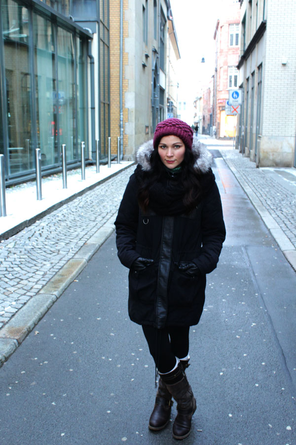 Schal und Mütze sind häufigste Kombinationsträger und zur Burgund-Mütze trage ich heute einen schwarzen Schlauchschal von H&M.